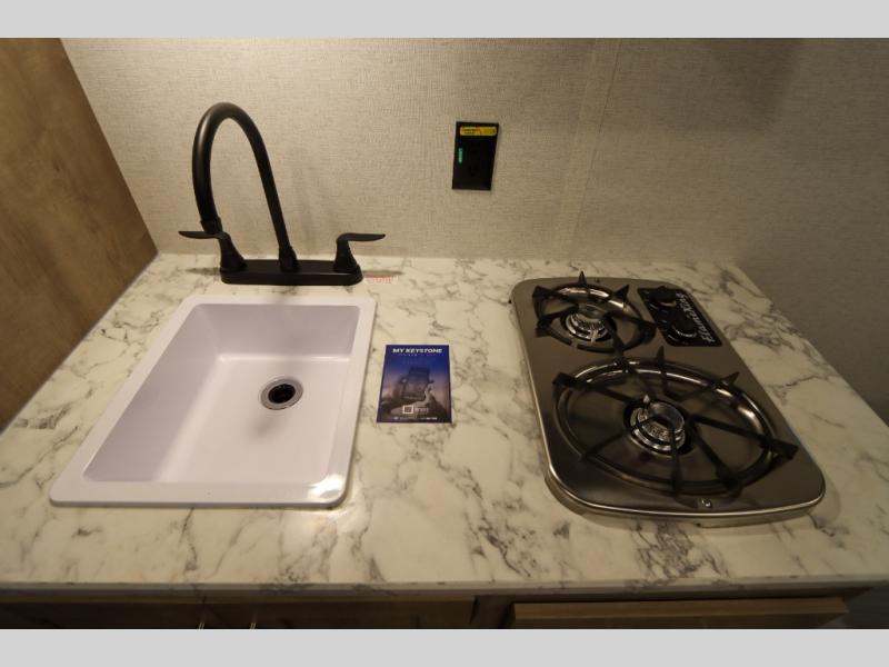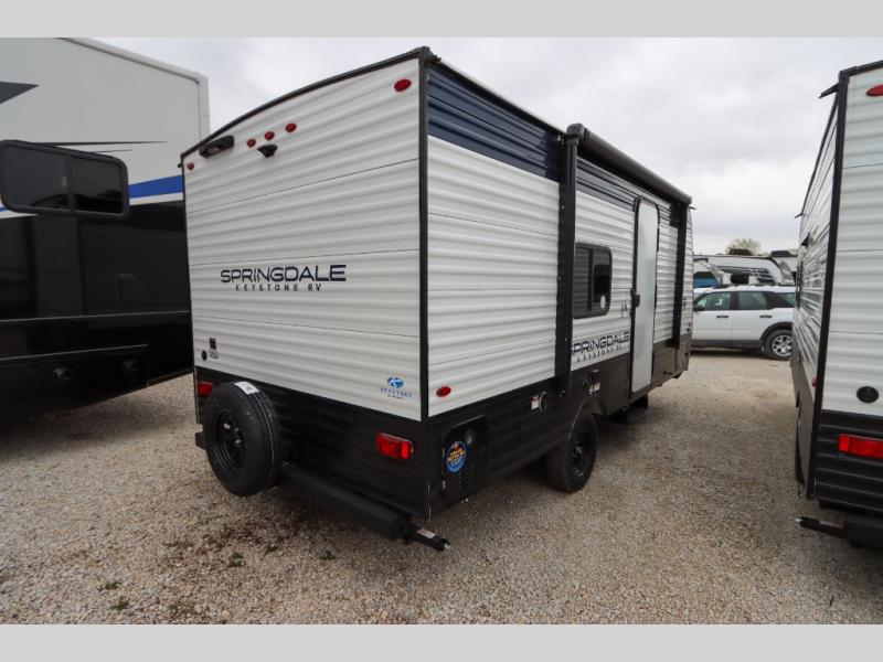 With any Springdale Classic Mini travel trailer by Keystone, you will enjoy lightweight towing thanks to their single-axle! You'll find the XL entry assist handle will make entering and exiting your unit easier than ever, and the power awning will provide protection from the sun as you relax in your camp chairs outside. Each model includes blackout night shades, solid wood cabinet doors and drawers, a shower skylight for more standing room, plus many more interior comforts. There is also a 5,000 BTU sidewall A/C and 20K BTU furnace to keep you comfortable, plus a Girard tankless water heater for endless hot showers!