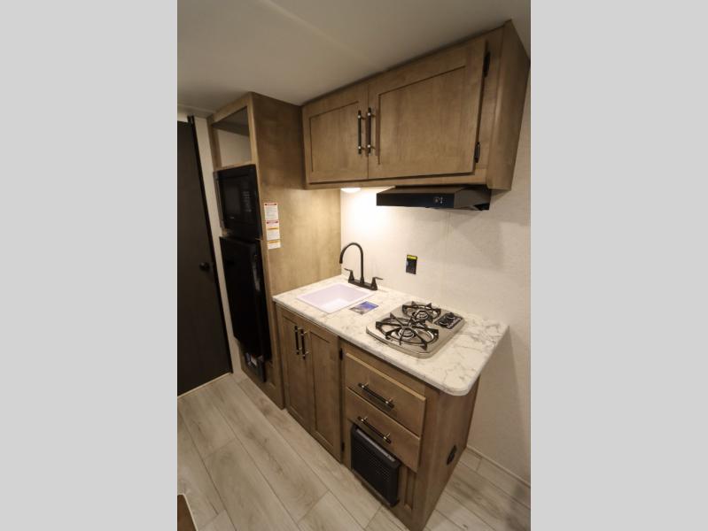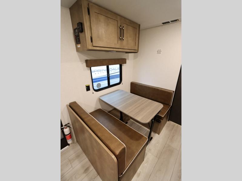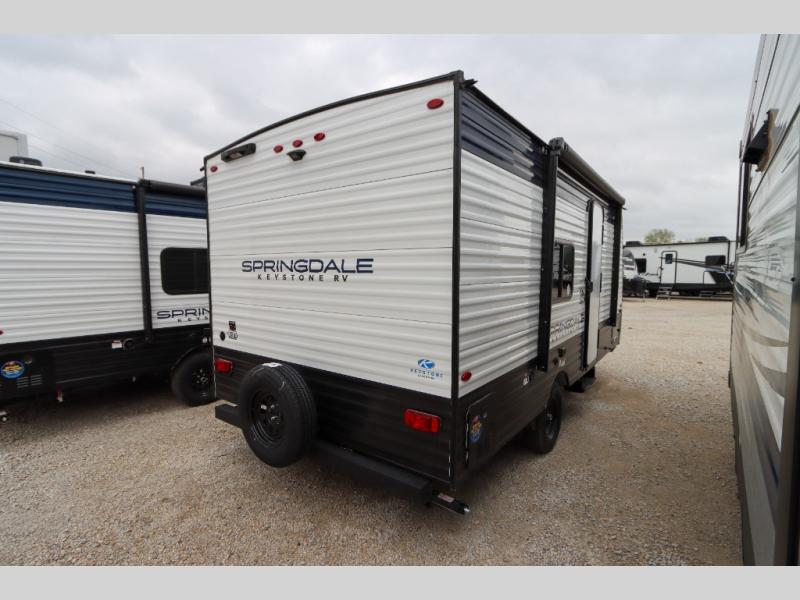 With any Springdale Classic Mini travel trailer by Keystone, you will enjoy lightweight towing thanks to their single-axle! You'll find the XL entry assist handle will make entering and exiting your unit easier than ever, and the power awning will provide protection from the sun as you relax in your camp chairs outside. Each model includes blackout night shades, solid wood cabinet doors and drawers, a shower skylight for more standing room, plus many more interior comforts. There is also a 5,000 BTU sidewall A/C and 20K BTU furnace to keep you comfortable, plus a Girard tankless water heater for endless hot showers!