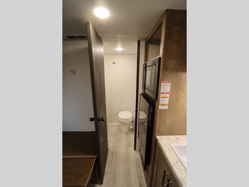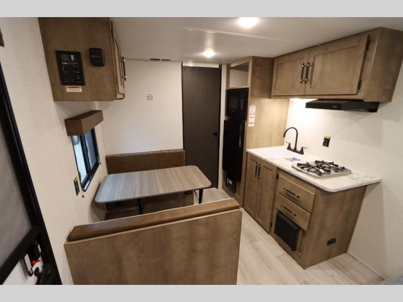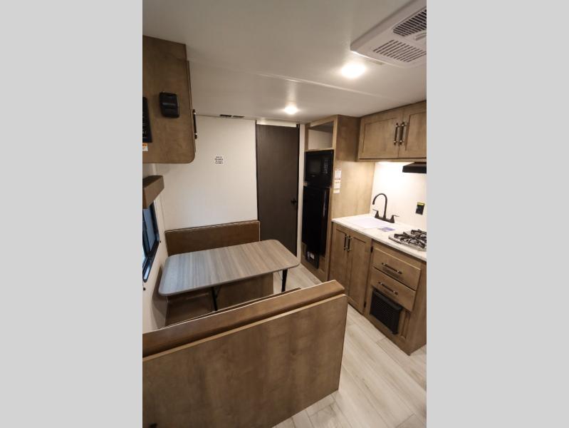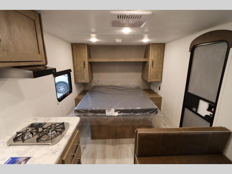 This cozy trailer for two or four will have you out enjoying nature easily. There is a queen bed for you, and the booth dinette can easily transform into a bed for one or two more campers if needed at night. The rear private bath features a shower and vanity with sink, plus toilet so no late night trips to the campground bathroom. There is ample storage in overhead cabinets on both sides of the trailer, as well as dual closets and nightstands on either side of the bed. A 10' awning offers even more living space outside. Grab a couple of camp chairs and enjoy hanging out with your campground neighbors or enjoying a campfire.