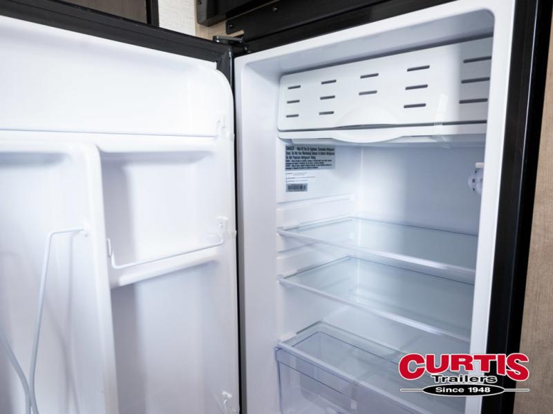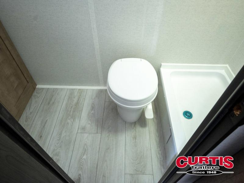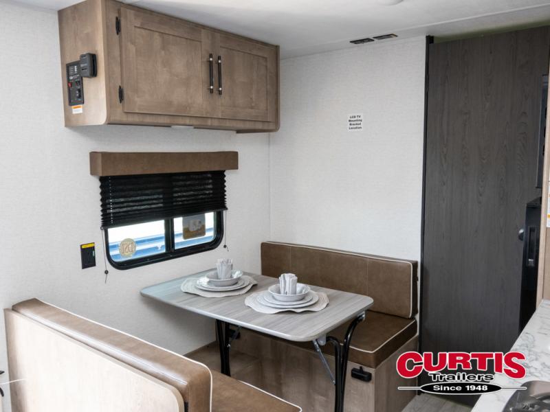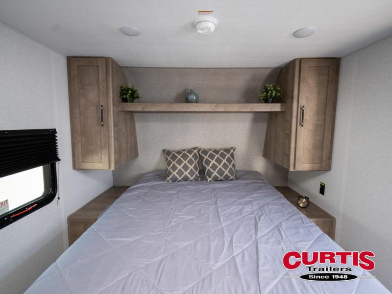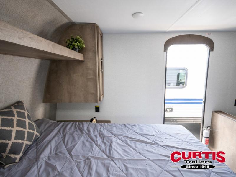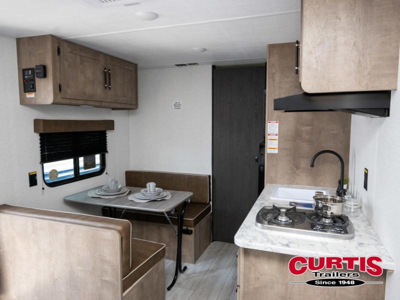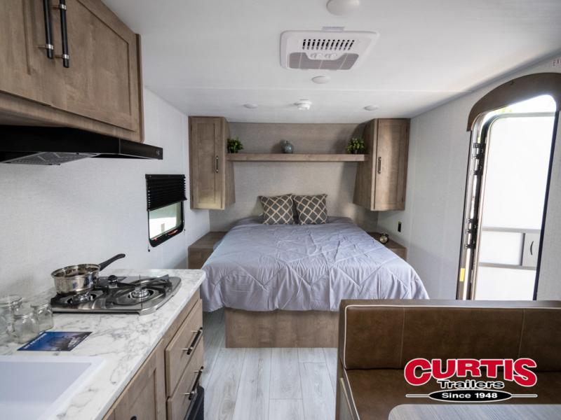 This cozy trailer for two or four will have you out enjoying nature easily. There is a queen bed for you, and the booth dinette can easily transform into a bed for one or two more campers if needed at night. The rear private bath features a shower and vanity with sink, plus toilet so no late night trips to the campground bathroom. There is ample storage in overhead cabinets on both sides of the trailer, as well as dual closets and nightstands on either side of the bed. A 10' awning offers even more living space outside. Grab a couple of camp chairs and enjoy hanging out with your campground neighbors or enjoying a campfire.