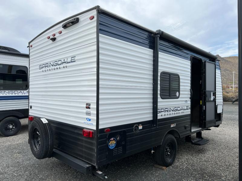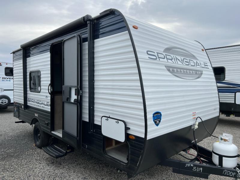 With any Springdale Classic Mini travel trailer by Keystone, you will enjoy lightweight towing thanks to their single-axle! You'll find the XL entry assist handle will make entering and exiting your unit easier than ever, and the power awning will provide protection from the sun as you relax in your camp chairs outside. Each model includes blackout night shades, solid wood cabinet doors and drawers, a shower skylight for more standing room, plus many more interior comforts. There is also a 5,000 BTU sidewall A/C and 20K BTU furnace to keep you comfortable, plus a Girard tankless water heater for endless hot showers!