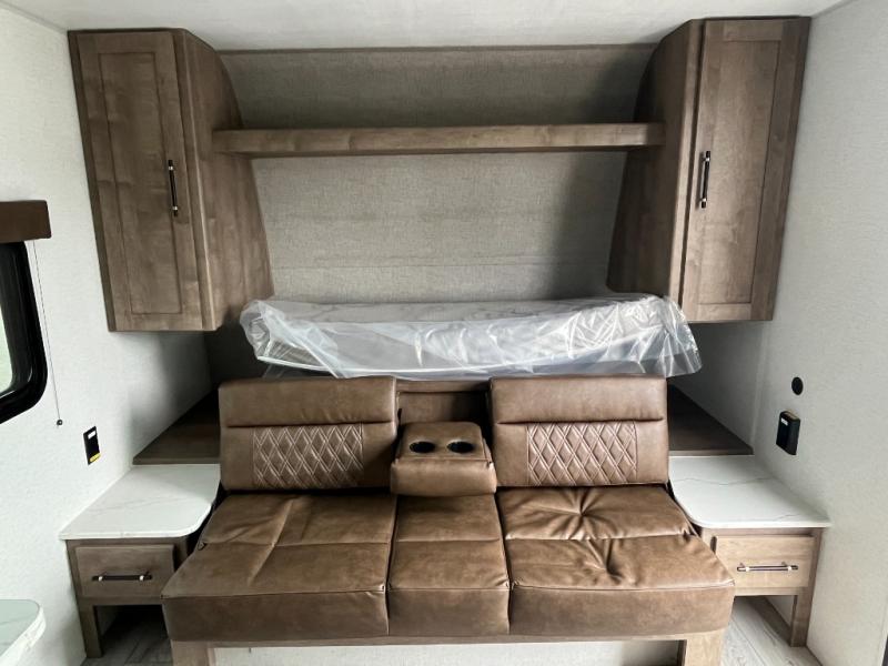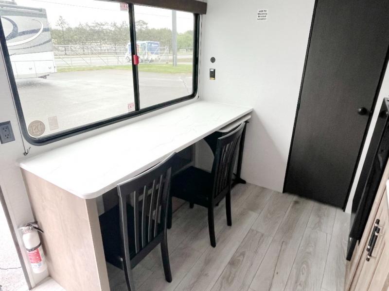 Time spent in this couple's trailer will be time well spent! You will love the amount of space you have each day since the queen Murphy bed can be put away to utilize the fold-down sofa. The chef of your group can make breakfast on the two burner gas cooktop and store leftovers in the 3.3 cu. ft. 12V refrigerator. The countertop with two chairs can be used as a desk or for dining space, and the full rear bath is sure to be appreciated!