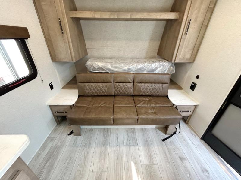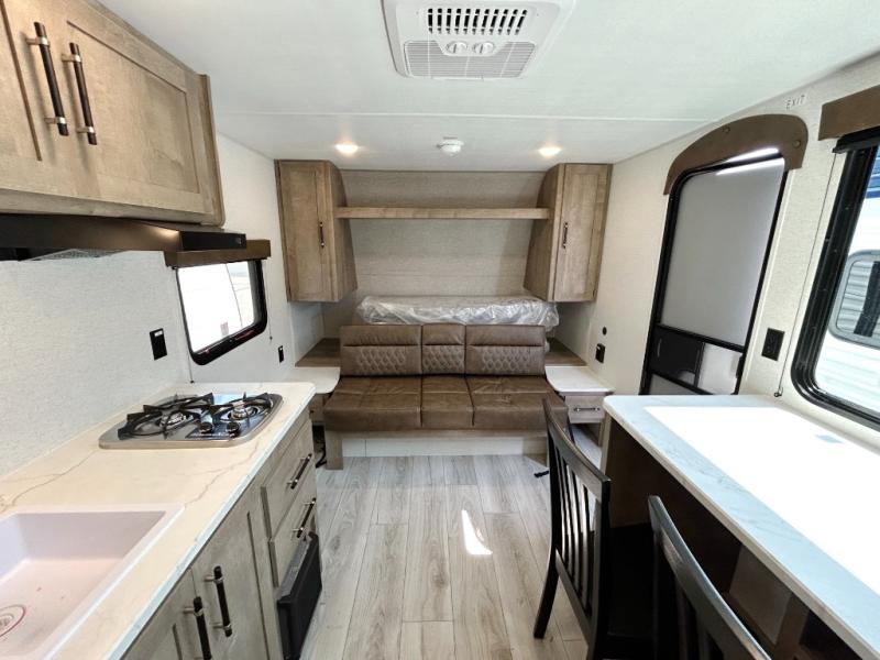 Time spent in this couple's trailer will be time well spent! You will love the amount of space you have each day since the queen Murphy bed can be put away to utilize the fold-down sofa. The chef of your group can make breakfast on the two burner gas cooktop and store leftovers in the 3.3 cu. ft. 12V refrigerator. The countertop with two chairs can be used as a desk or for dining space, and the full rear bath is sure to be appreciated!