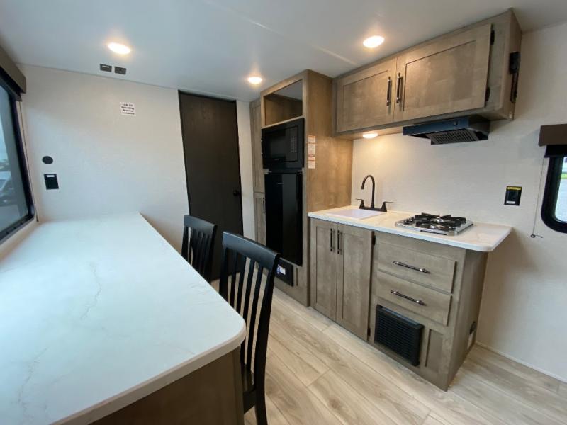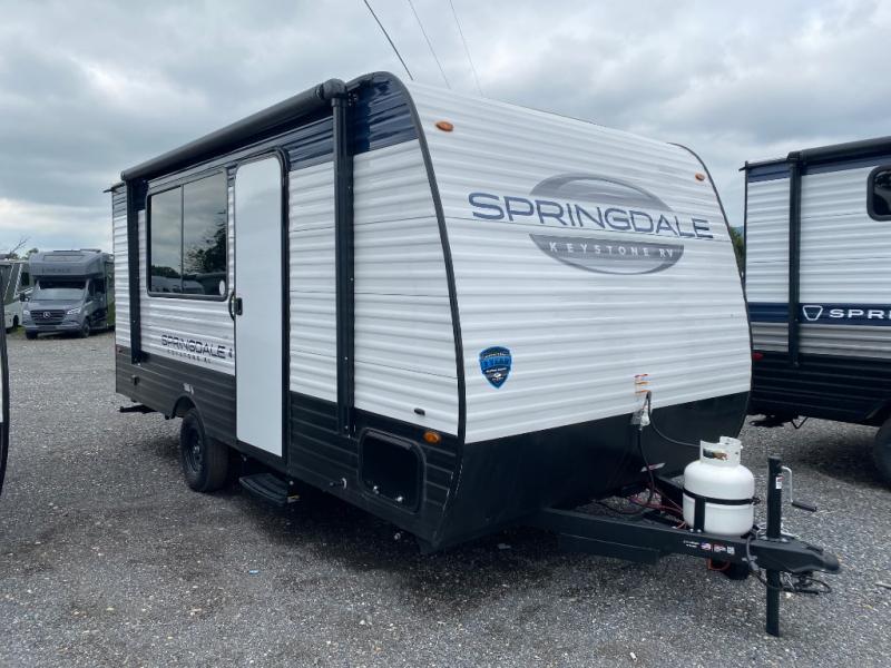 With any Springdale Classic Mini travel trailer by Keystone, you will enjoy lightweight towing thanks to their single-axle! You'll find the XL entry assist handle will make entering and exiting your unit easier than ever, and the power awning will provide protection from the sun as you relax in your camp chairs outside. Each model includes blackout night shades, solid wood cabinet doors and drawers, a shower skylight for more standing room, plus many more interior comforts. There is also a 5,000 BTU sidewall A/C and 20K BTU furnace to keep you comfortable, plus a Girard tankless water heater for endless hot showers!