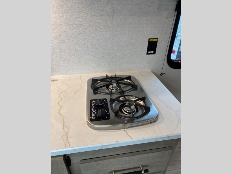 Time spent in this couple's trailer will be time well spent! You will love the amount of space you have each day since the queen Murphy bed can be put away to utilize the fold-down sofa. The chef of your group can make breakfast on the two burner gas cooktop and store leftovers in the 3.3 cu. ft. 12V refrigerator. The countertop with two chairs can be used as a desk or for dining space, and the full rear bath is sure to be appreciated!