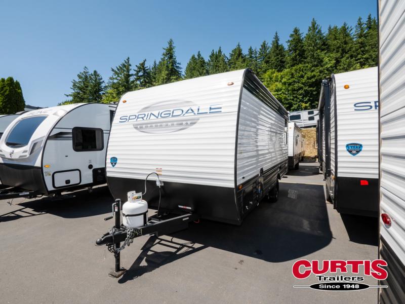 With any Springdale Classic Mini travel trailer by Keystone, you will enjoy lightweight towing thanks to their single-axle! You'll find the XL entry assist handle will make entering and exiting your unit easier than ever, and the power awning will provide protection from the sun as you relax in your camp chairs outside. Each model includes blackout night shades, solid wood cabinet doors and drawers, a shower skylight for more standing room, plus many more interior comforts. There is also a 5,000 BTU sidewall A/C and 20K BTU furnace to keep you comfortable, plus a Girard tankless water heater for endless hot showers!