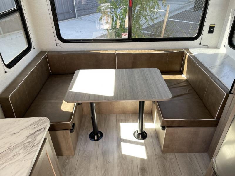 You will find lots of storage inside and outside this trailer allowing you to bring along everything you need for a great camping trip! Along the exterior there is a pass-thru compartment for your outdoor gear and a 10' power awning giving you a covered outdoor living area to enjoy. The cook will have a two burner gas range to make meals, and everyone can dine around the U-shaped dinette. There is a full bathroom to get cleaned up in before bedtime, and a queen bed to fall asleep quickly so you can have fun again tomorrow.