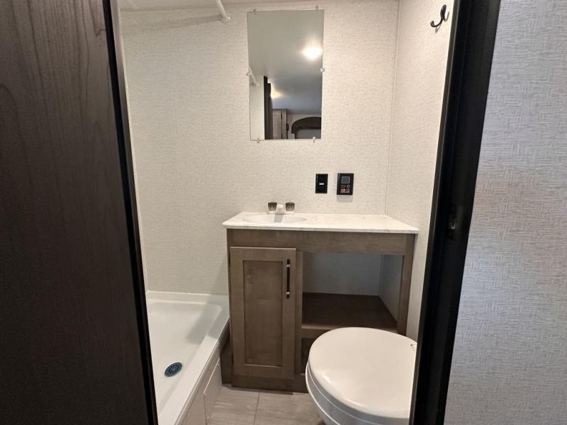 You will find lots of storage inside and outside this trailer allowing you to bring along everything you need for a great camping trip! Along the exterior there is a pass-thru compartment for your outdoor gear and a 10' power awning giving you a covered outdoor living area to enjoy. The cook will have a two burner gas range to make meals, and everyone can dine around the U-shaped dinette. There is a full bathroom to get cleaned up in before bedtime, and a queen bed to fall asleep quickly so you can have fun again tomorrow.