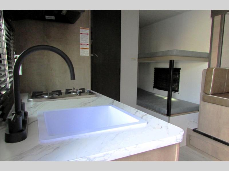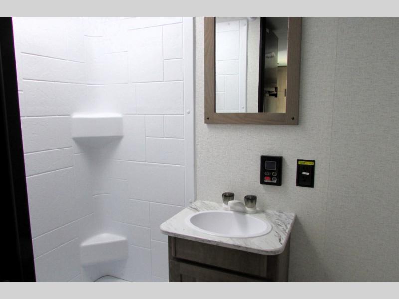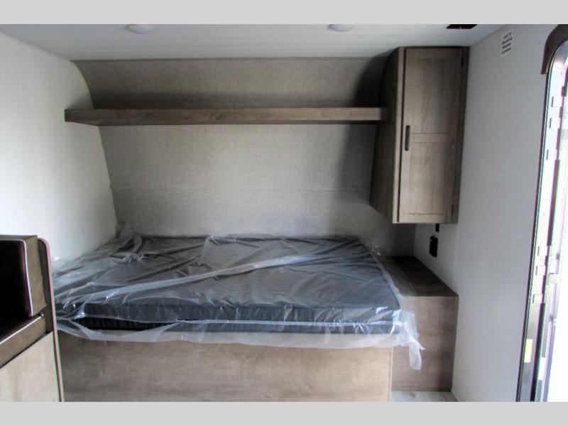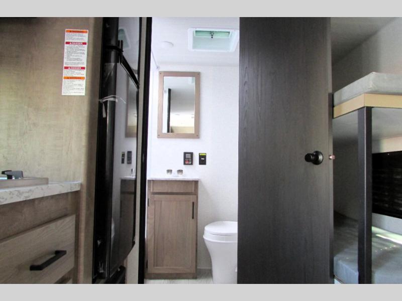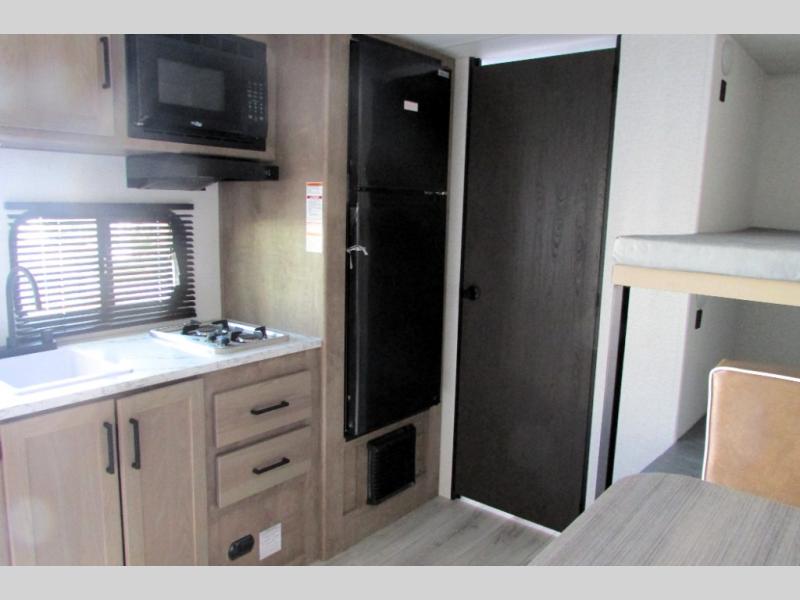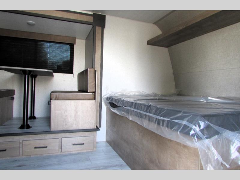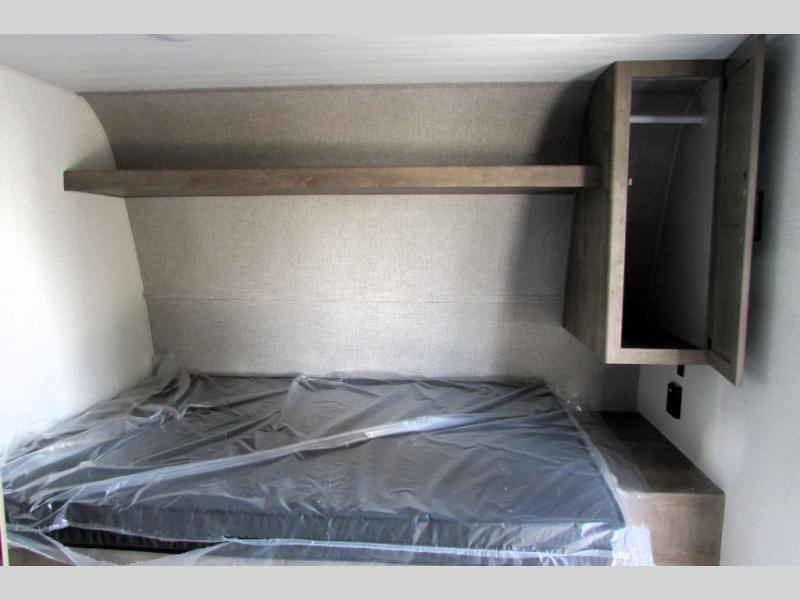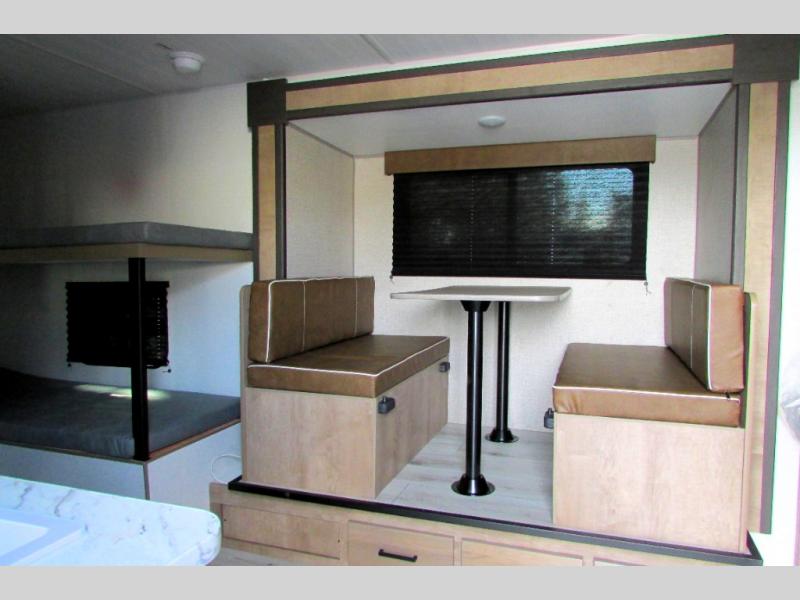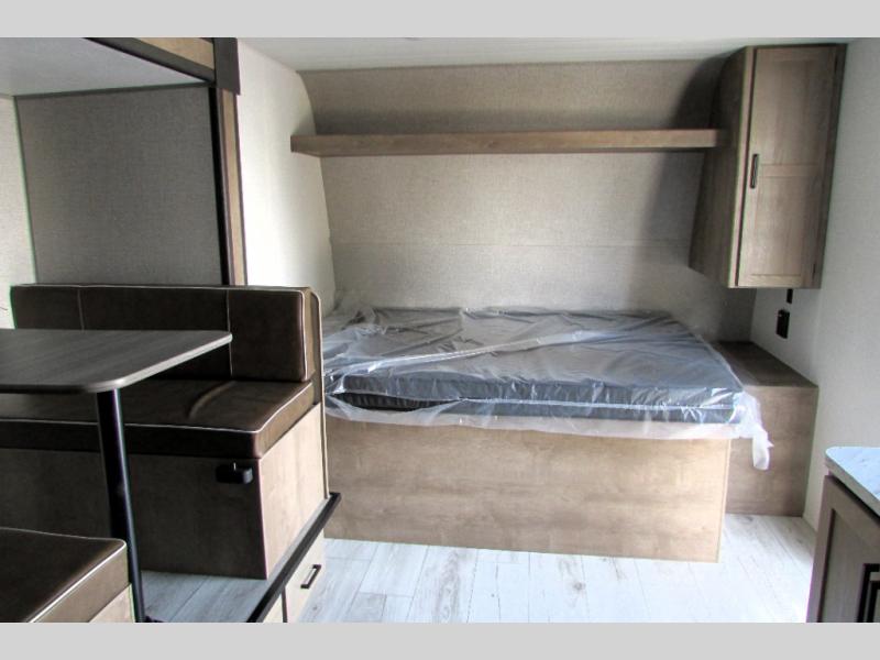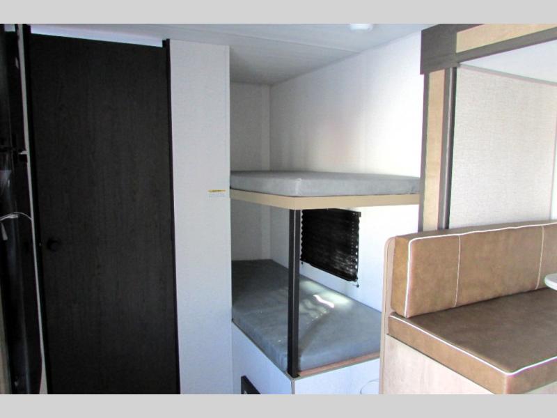 When you say "camping" your kids will immediately think about sleeping on the bunk beds and playing outdoors! There is something about planning the trip that gets everyone excited, and once at your campsite, the excitement grows. You will have your own bed up front as well as a closet and nightstand for your things. The booth dinette doubles as sleeping space and includes drawers for storage, plus the slide provides more floor space. The cook can make warm meals in the galley kitchen, and the full bathroom will keep everyone refreshed and ready for the next day.