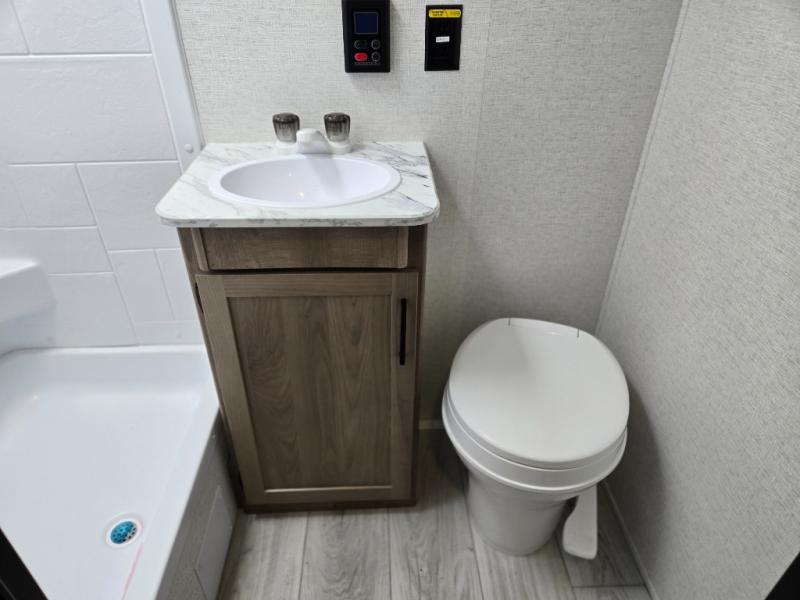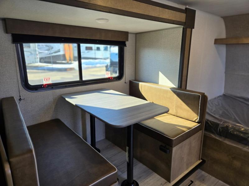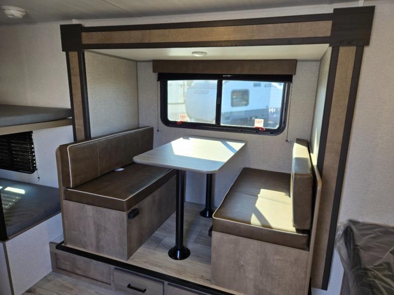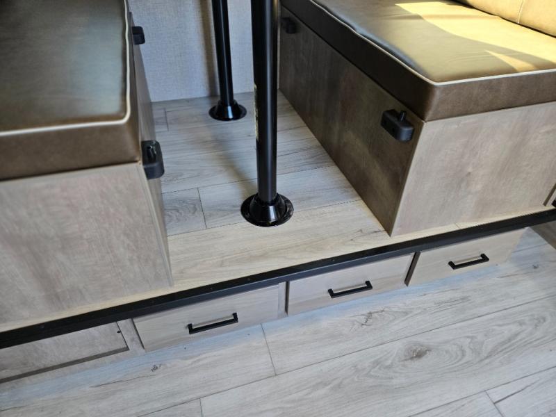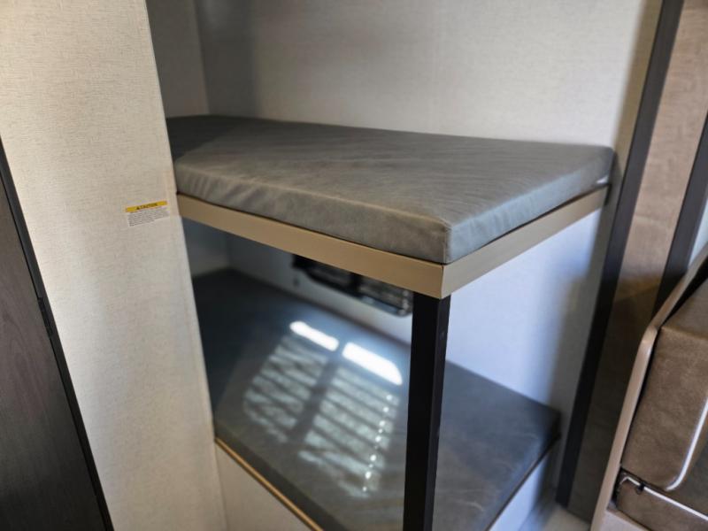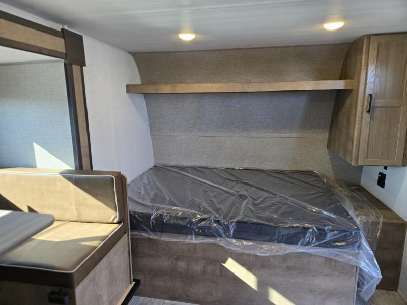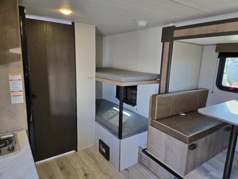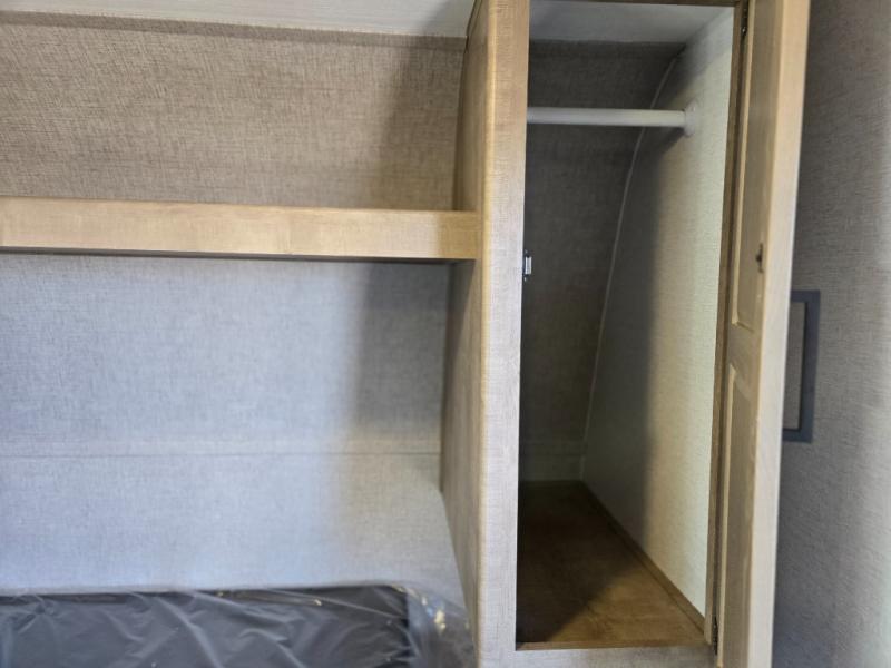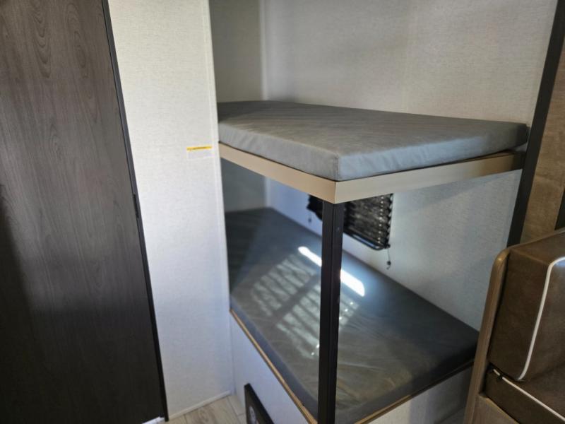 When you say "camping" your kids will immediately think about sleeping on the bunk beds and playing outdoors! There is something about planning the trip that gets everyone excited, and once at your campsite, the excitement grows. You will have your own bed up front as well as a closet and nightstand for your things. The booth dinette doubles as sleeping space and includes drawers for storage, plus the slide provides more floor space. The cook can make warm meals in the galley kitchen, and the full bathroom will keep everyone refreshed and ready for the next day.