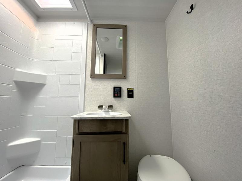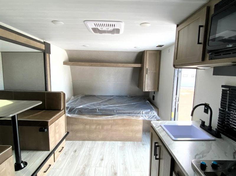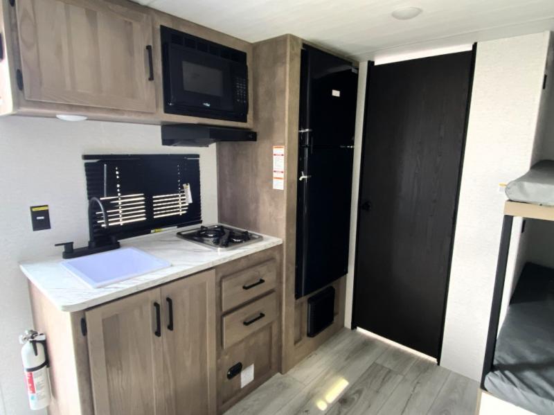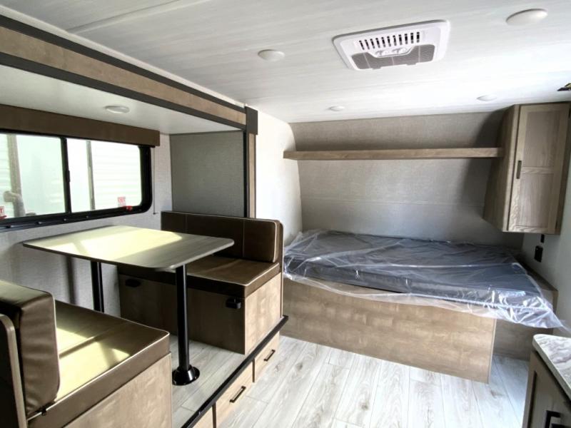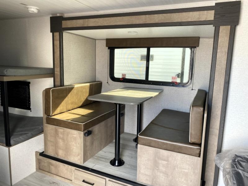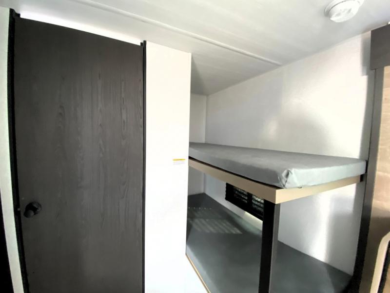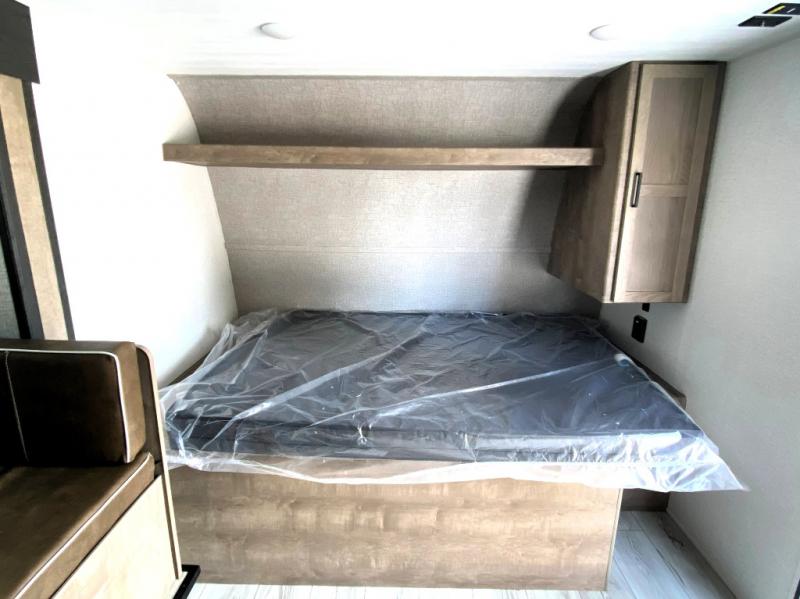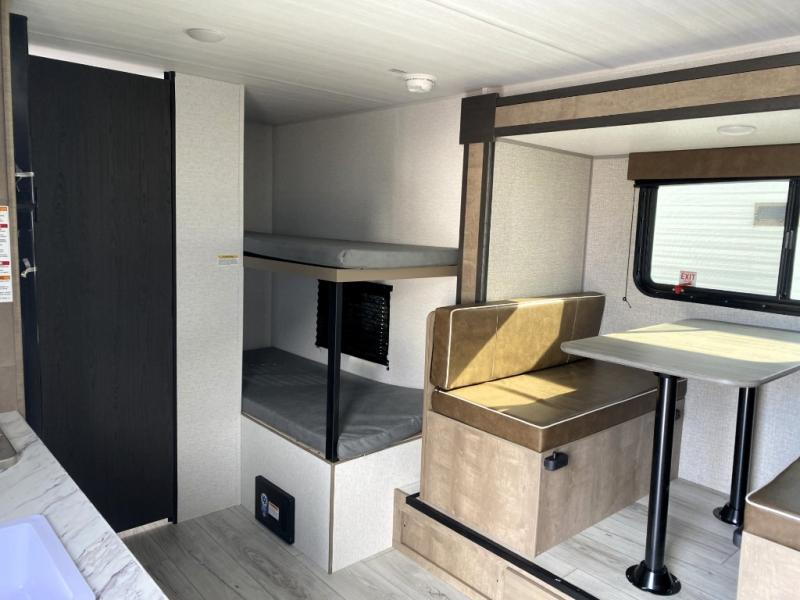 When you say "camping" your kids will immediately think about sleeping on the bunk beds and playing outdoors! There is something about planning the trip that gets everyone excited, and once at your campsite, the excitement grows. You will have your own bed up front as well as a closet and nightstand for your things. The booth dinette doubles as sleeping space and includes drawers for storage, plus the slide provides more floor space. The cook can make warm meals in the galley kitchen, and the full bathroom will keep everyone refreshed and ready for the next day.
