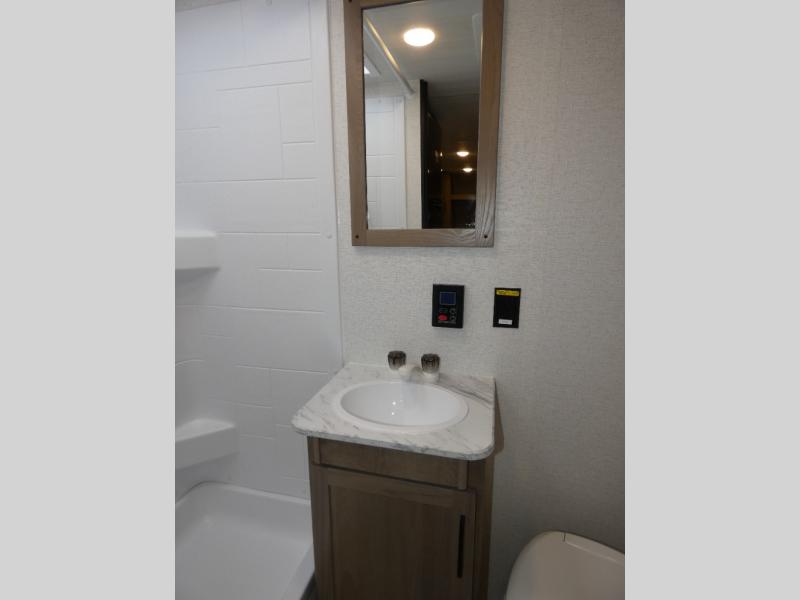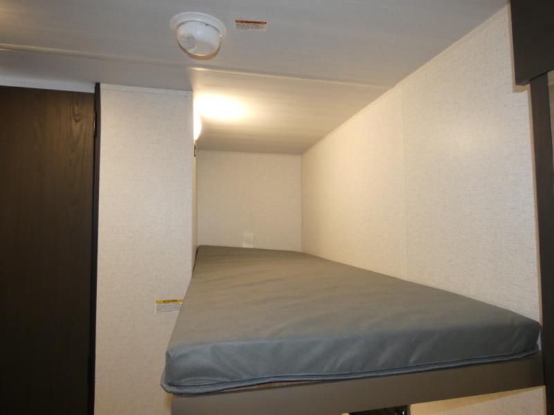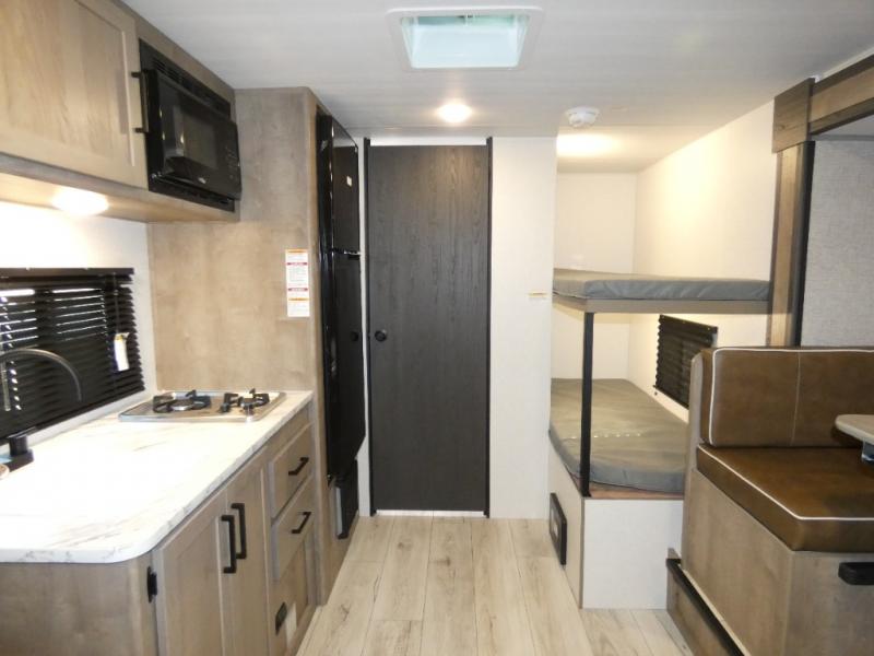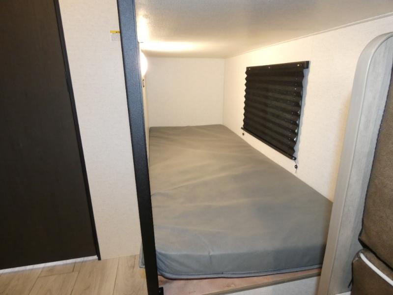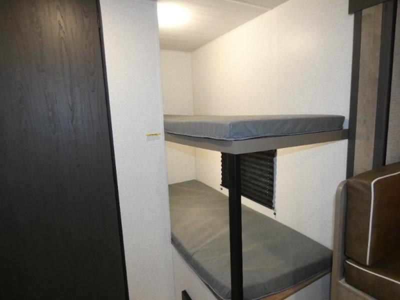 When you say "camping" your kids will immediately think about sleeping on the bunk beds and playing outdoors! There is something about planning the trip that gets everyone excited, and once at your campsite, the excitement grows. You will have your own bed up front as well as a closet and nightstand for your things. The booth dinette doubles as sleeping space and includes drawers for storage, plus the slide provides more floor space. The cook can make warm meals in the galley kitchen, and the full bathroom will keep everyone refreshed and ready for the next day.
