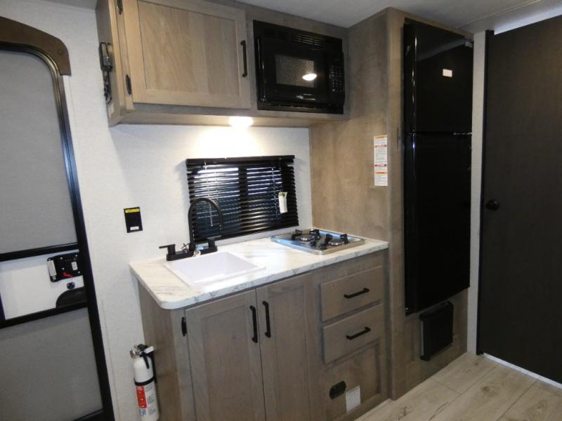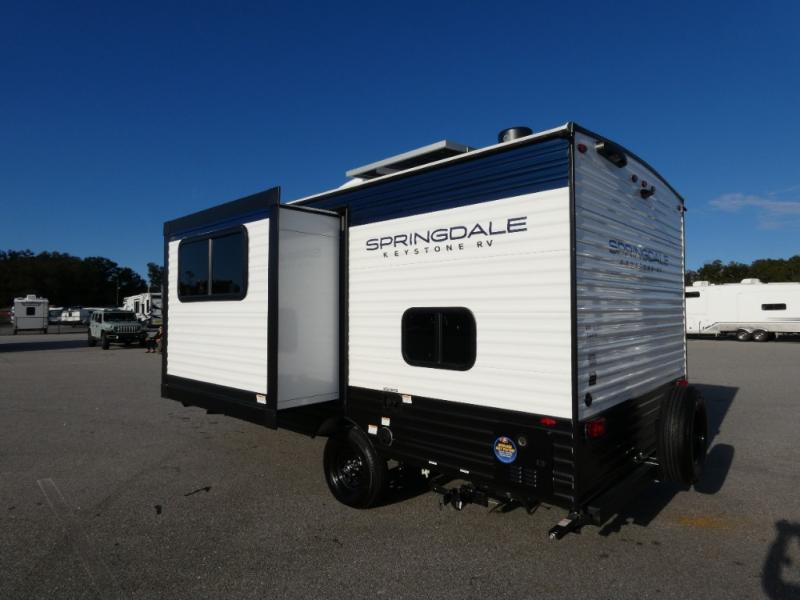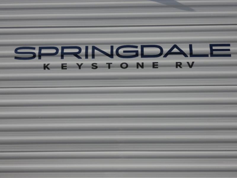 With any Springdale Classic Mini travel trailer by Keystone, you will enjoy lightweight towing thanks to their single-axle! You'll find the XL entry assist handle will make entering and exiting your unit easier than ever, and the power awning will provide protection from the sun as you relax in your camp chairs outside. Each model includes blackout night shades, solid wood cabinet doors and drawers, a shower skylight for more standing room, plus many more interior comforts. There is also a 5,000 BTU sidewall A/C and 20K BTU furnace to keep you comfortable, plus a Girard tankless water heater for endless hot showers!