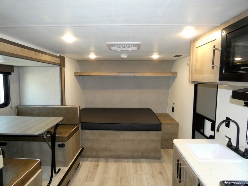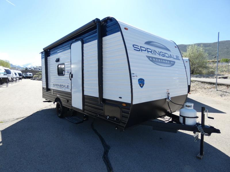With any Springdale Classic Mini travel trailer by Keystone, you will enjoy lightweight towing thanks to their single-axle! You'll find the XL entry assist handle will make entering and exiting your unit easier than ever, and the power awning will provide protection from the sun as you relax in your camp chairs outside. Each model includes blackout night shades, solid wood cabinet doors and drawers, a shower skylight for more standing room, plus many more interior comforts. There is also a 5,000 BTU sidewall A/C and 20K BTU furnace to keep you comfortable, plus a Girard tankless water heater for endless hot showers!