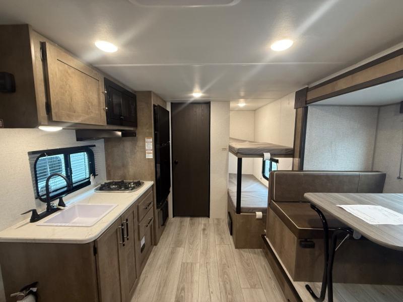 When you say "camping" your kids will immediately think about sleeping on the bunk beds and playing outdoors! There is something about planning the trip that gets everyone excited, and once at your campsite, the excitement grows. You will have your own bed up front as well as a closet and nightstand for your things. The booth dinette doubles as sleeping space and includes drawers for storage, plus the slide provides more floor space. The cook can make warm meals in the galley kitchen, and the full bathroom will keep everyone refreshed and ready for the next day.