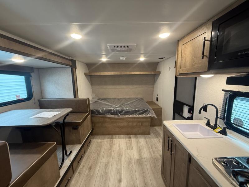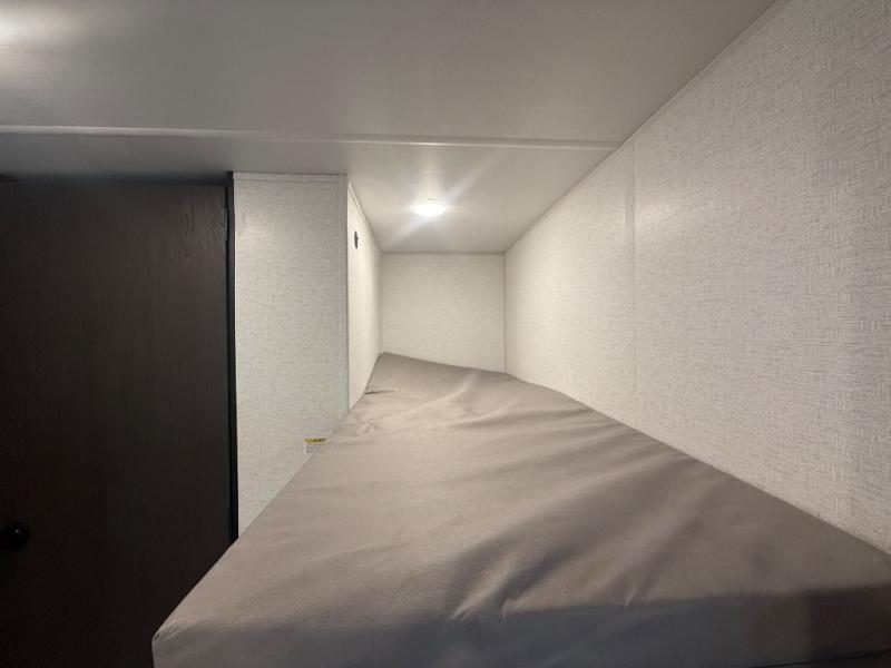 When you say "camping" your kids will immediately think about sleeping on the bunk beds and playing outdoors! There is something about planning the trip that gets everyone excited, and once at your campsite, the excitement grows. You will have your own bed up front as well as a closet and nightstand for your things. The booth dinette doubles as sleeping space and includes drawers for storage, plus the slide provides more floor space. The cook can make warm meals in the galley kitchen, and the full bathroom will keep everyone refreshed and ready for the next day.