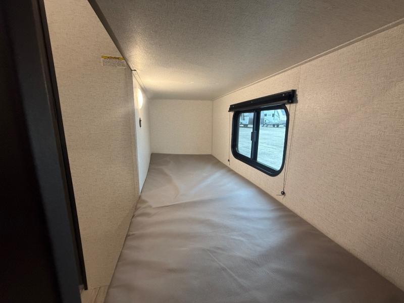 When you say "camping" your kids will immediately think about sleeping on the bunk beds and playing outdoors! There is something about planning the trip that gets everyone excited, and once at your campsite, the excitement grows. You will have your own bed up front as well as a closet and nightstand for your things. The booth dinette doubles as sleeping space and includes drawers for storage, plus the slide provides more floor space. The cook can make warm meals in the galley kitchen, and the full bathroom will keep everyone refreshed and ready for the next day.