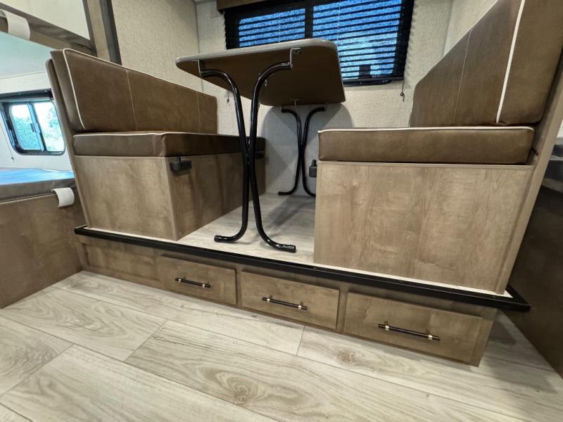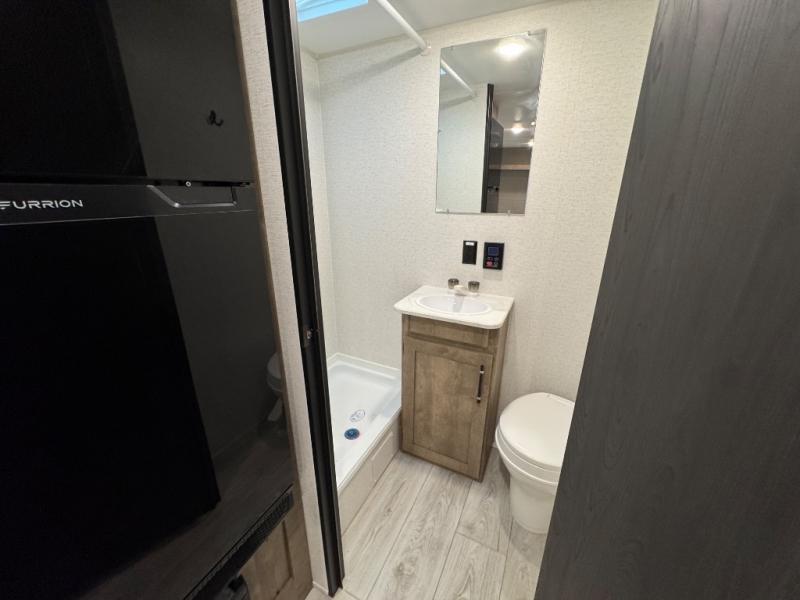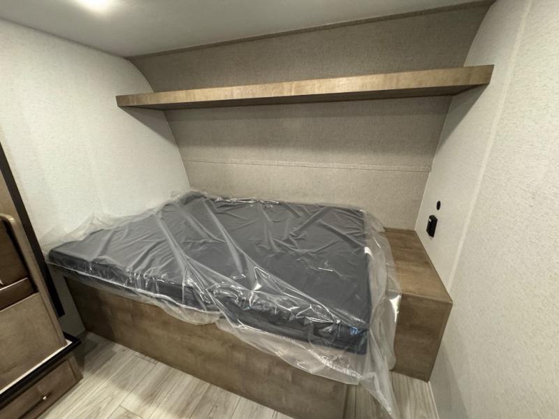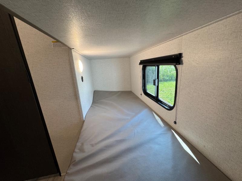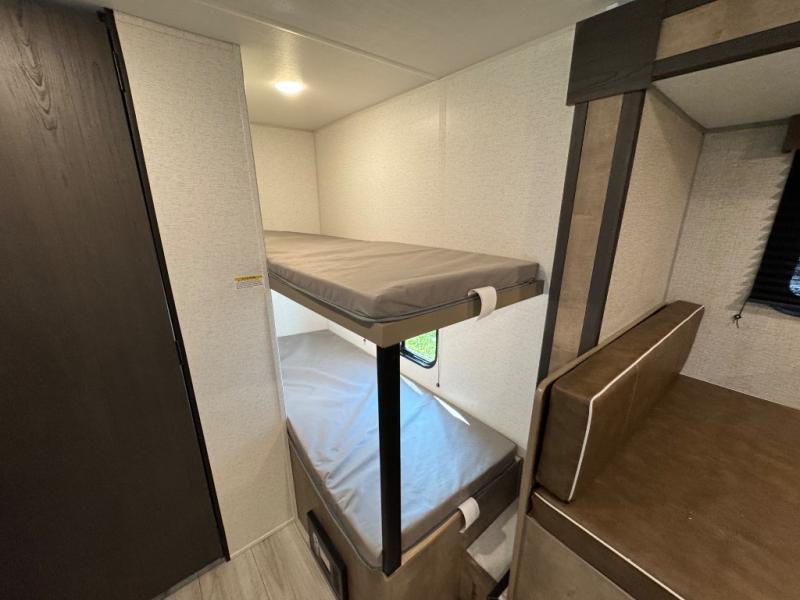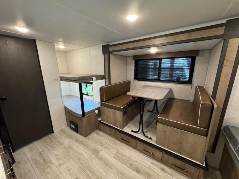 When you say "camping" your kids will immediately think about sleeping on the bunk beds and playing outdoors! There is something about planning the trip that gets everyone excited, and once at your campsite, the excitement grows. You will have your own bed up front as well as a closet and nightstand for your things. The booth dinette doubles as sleeping space and includes drawers for storage, plus the slide provides more floor space. The cook can make warm meals in the galley kitchen, and the full bathroom will keep everyone refreshed and ready for the next day.