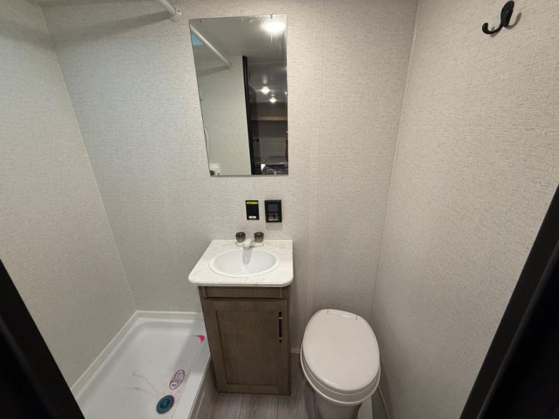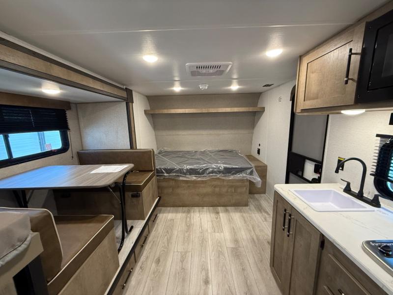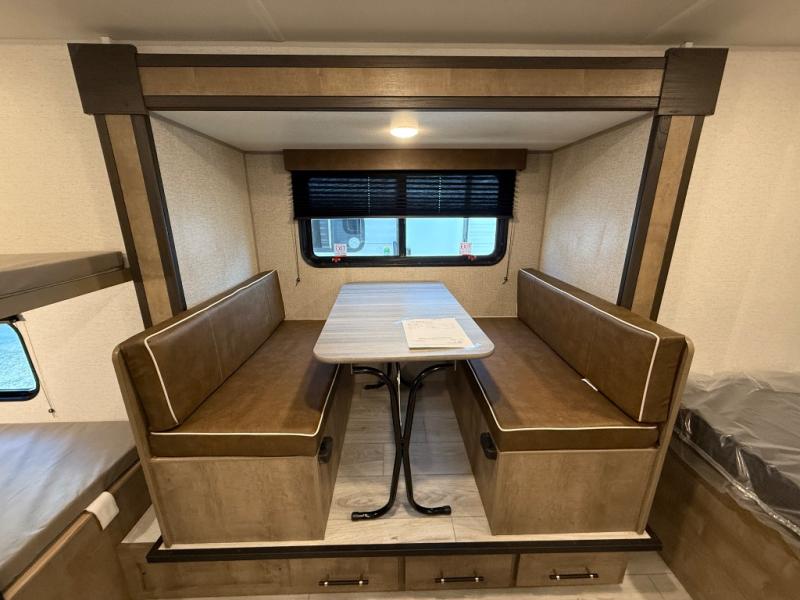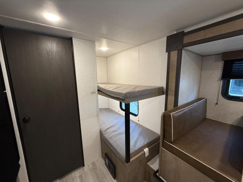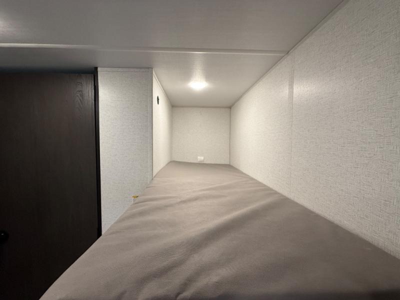 When you say "camping" your kids will immediately think about sleeping on the bunk beds and playing outdoors! There is something about planning the trip that gets everyone excited, and once at your campsite, the excitement grows. You will have your own bed up front as well as a closet and nightstand for your things. The booth dinette doubles as sleeping space and includes drawers for storage, plus the slide provides more floor space. The cook can make warm meals in the galley kitchen, and the full bathroom will keep everyone refreshed and ready for the next day.