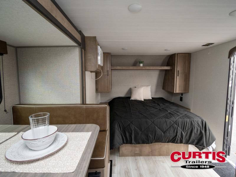 This is the perfect couple's RV with a walk-around queen bed up front with dual closets and nightstands, and a spacious rear bathroom. The galley kitchen offers a two burner cooktop and a sink to wash the dishes, plus there is a 7.7 cu. ft. 12V refrigerator for the cold items. You two can dine at the booth dinette slide which offers more floor space, plus there is drawer storage for your hand towels, pots and/or blankets. The 10' power awning provides protection so you can sit on your camping chairs while enjoying the outdoors.