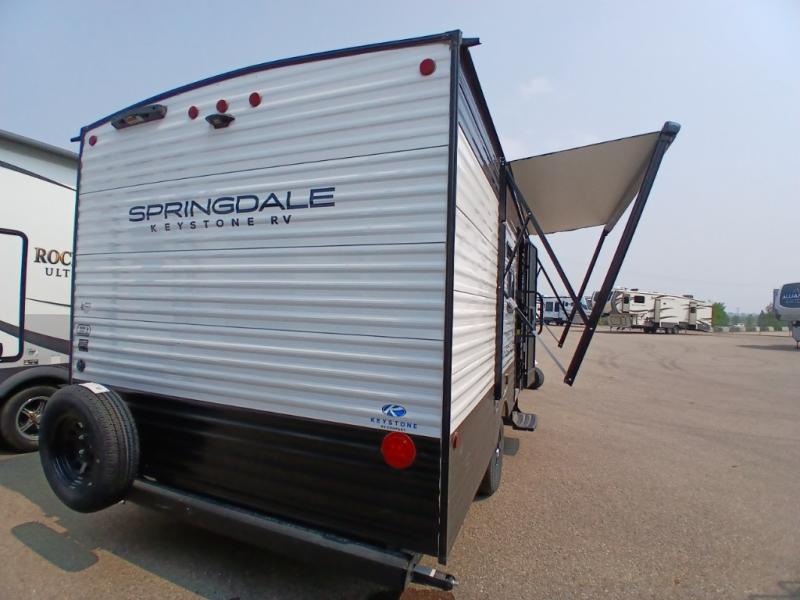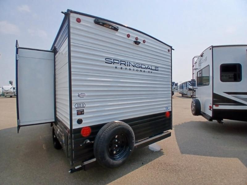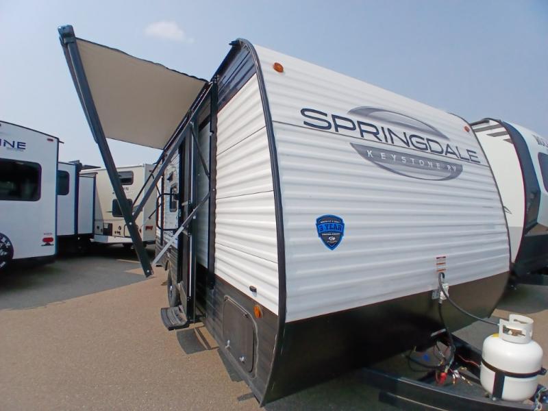 With any Springdale Classic Mini travel trailer by Keystone, you will enjoy lightweight towing thanks to their single-axle! You'll find the XL entry assist handle will make entering and exiting your unit easier than ever, and the power awning will provide protection from the sun as you relax in your camp chairs outside. Each model includes blackout night shades, solid wood cabinet doors and drawers, a shower skylight for more standing room, plus many more interior comforts. There is also a 5,000 BTU sidewall A/C and 20K BTU furnace to keep you comfortable, plus a Girard tankless water heater for endless hot showers!