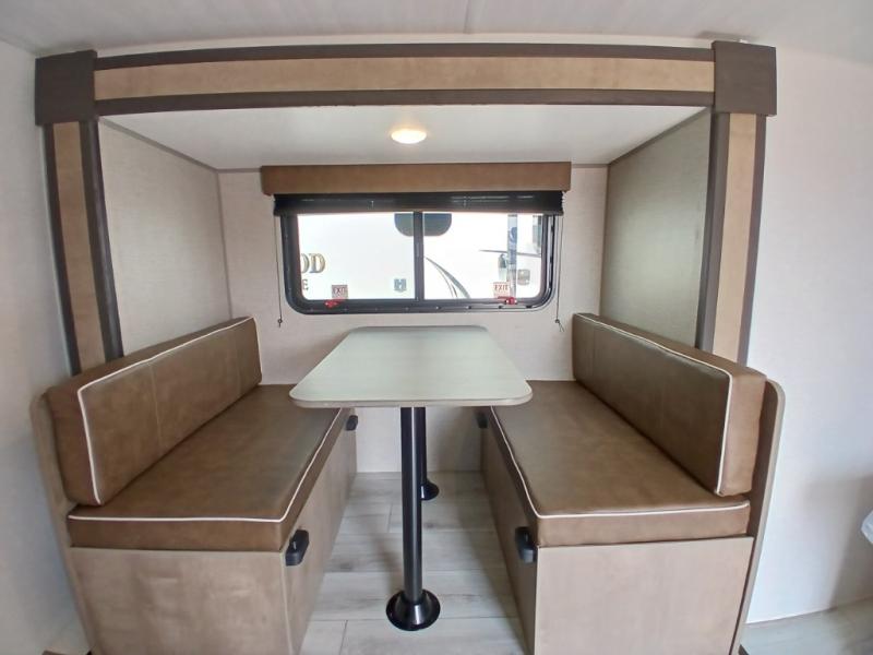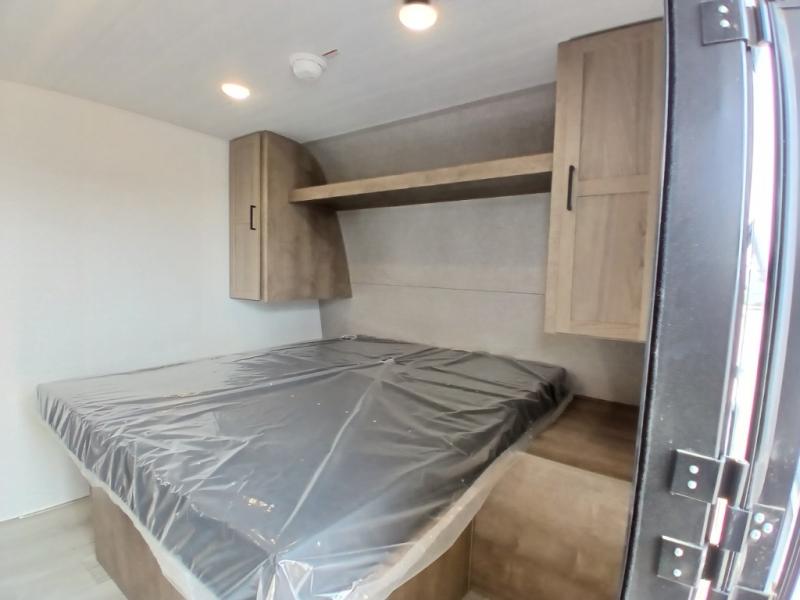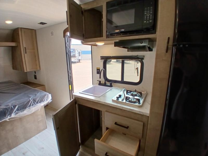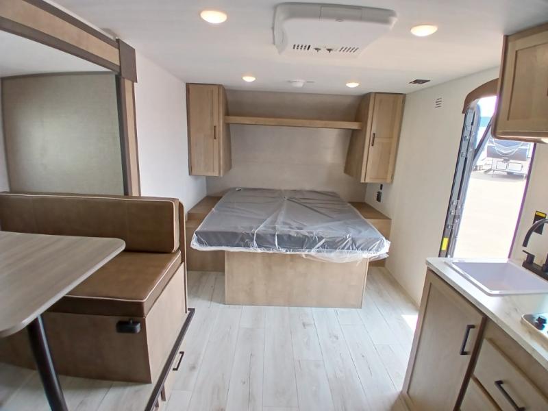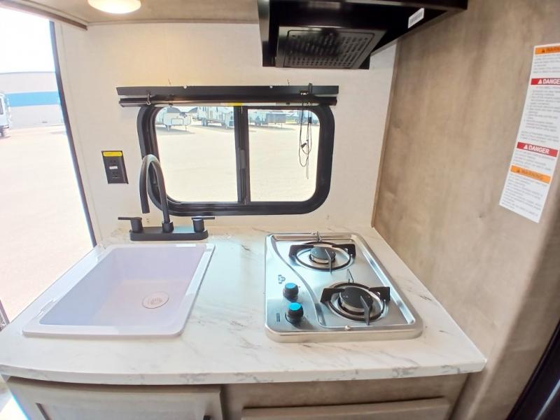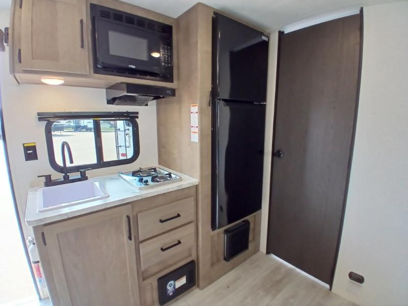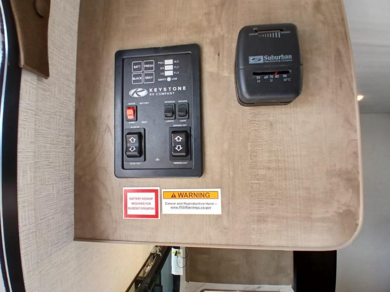 This is the perfect couple's RV with a walk-around queen bed up front with dual closets and nightstands, and a spacious rear bathroom. The galley kitchen offers a two burner cooktop and a sink to wash the dishes, plus there is a 7.7 cu. ft. 12V refrigerator for the cold items. You two can dine at the booth dinette slide which offers more floor space, plus there is drawer storage for your hand towels, pots and/or blankets. The 10' power awning provides protection so you can sit on your camping chairs while enjoying the outdoors.