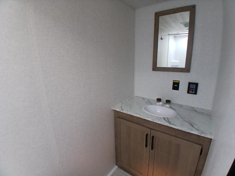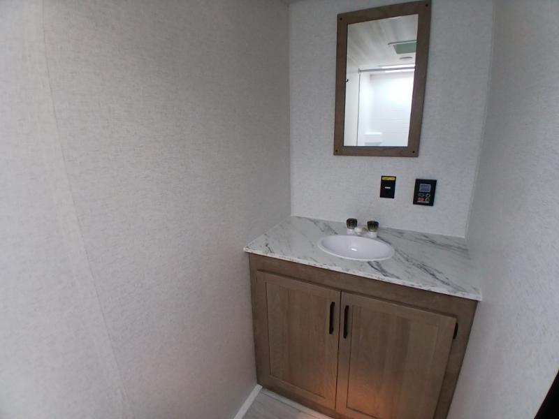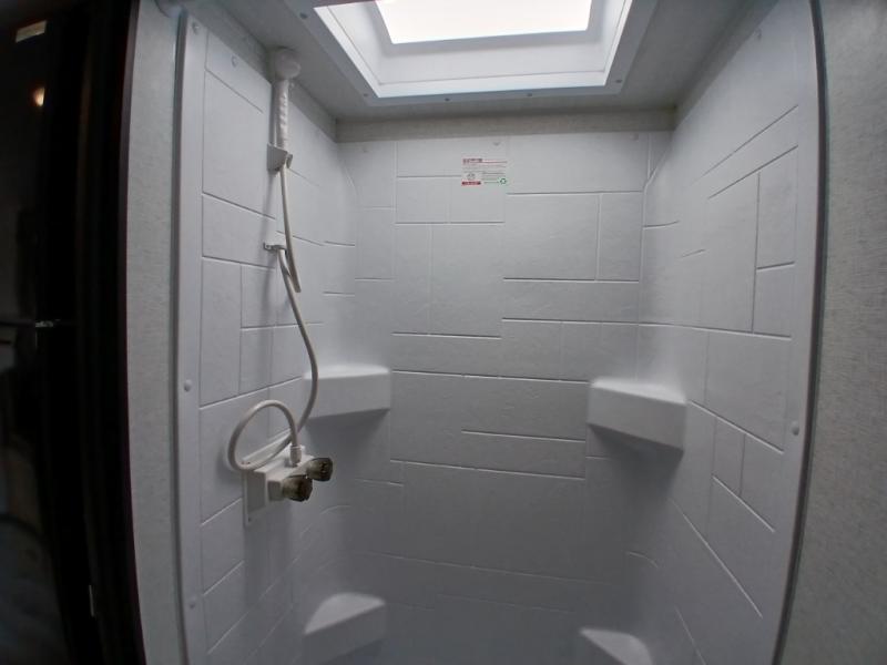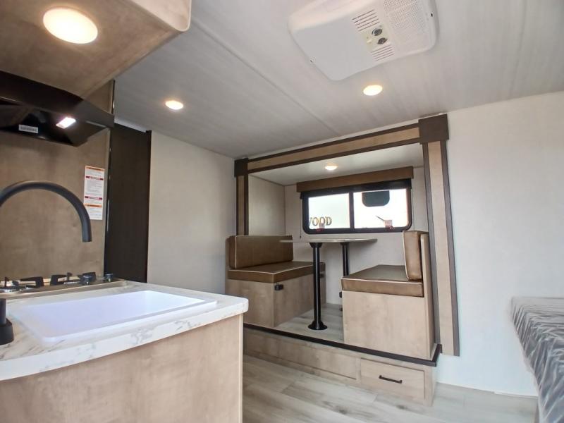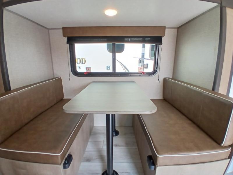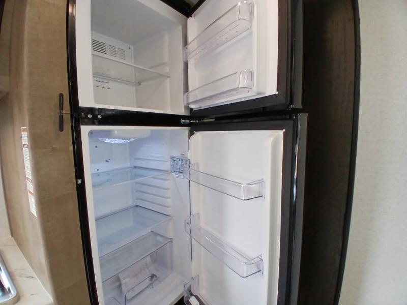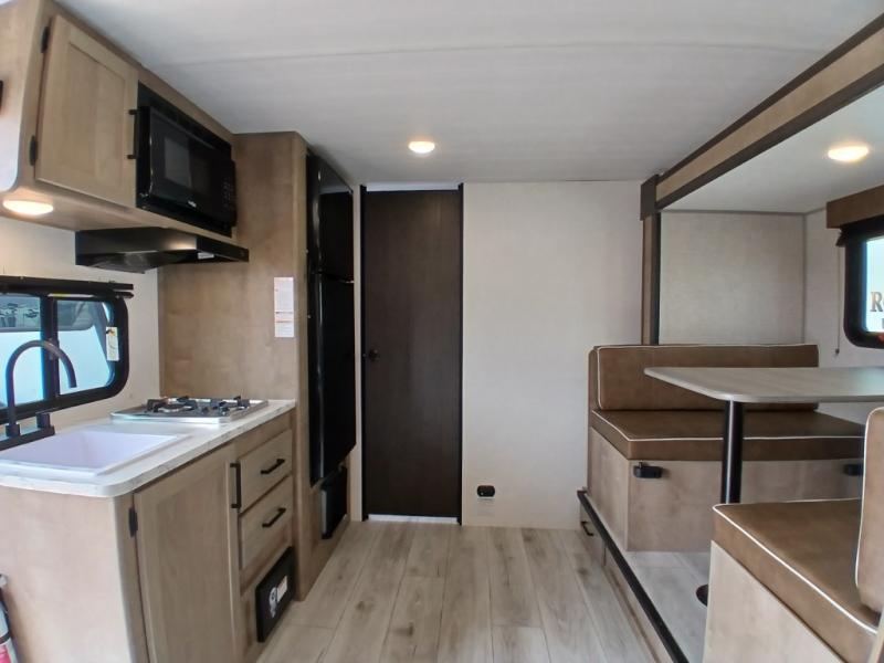 This is the perfect couple's RV with a walk-around queen bed up front with dual closets and nightstands, and a spacious rear bathroom. The galley kitchen offers a two burner cooktop and a sink to wash the dishes, plus there is a 7.7 cu. ft. 12V refrigerator for the cold items. You two can dine at the booth dinette slide which offers more floor space, plus there is drawer storage for your hand towels, pots and/or blankets. The 10' power awning provides protection so you can sit on your camping chairs while enjoying the outdoors.
