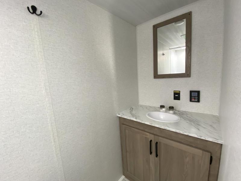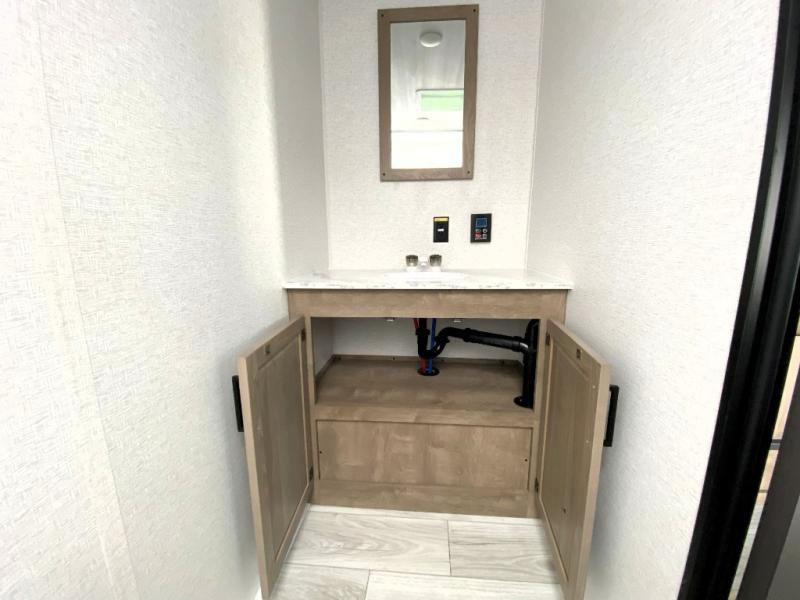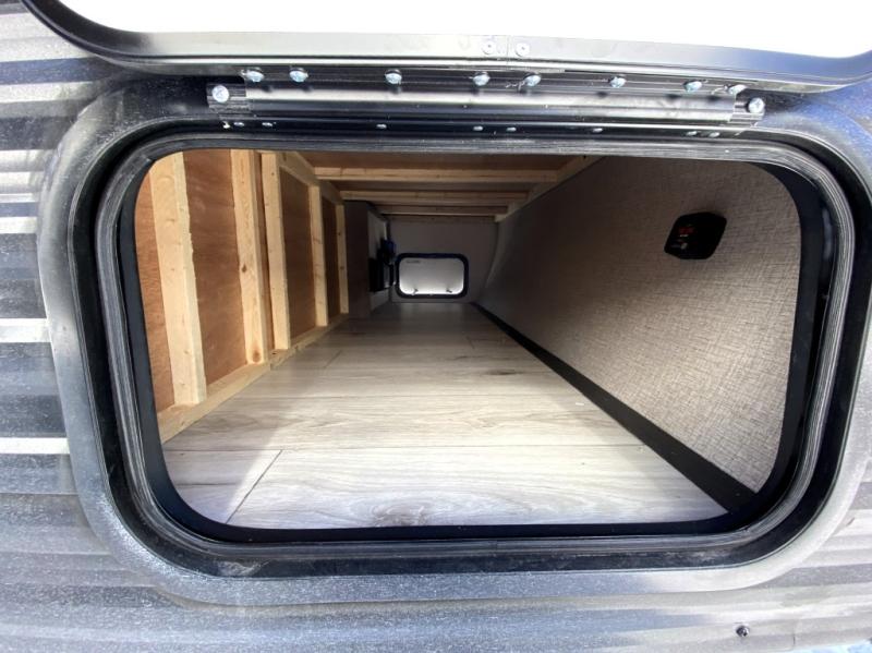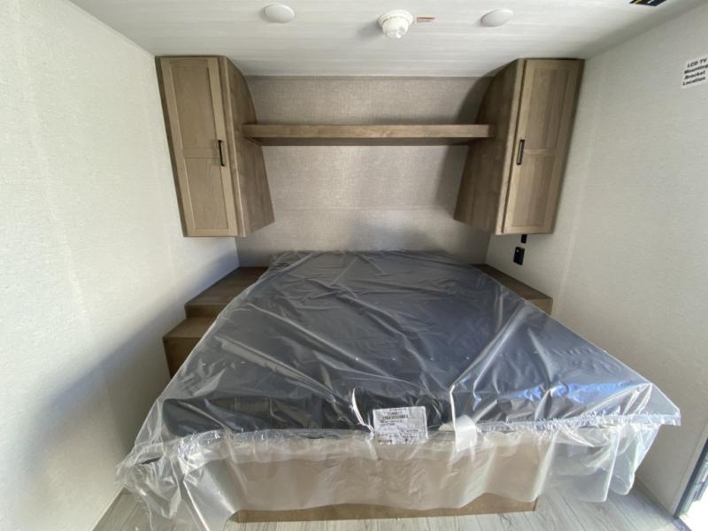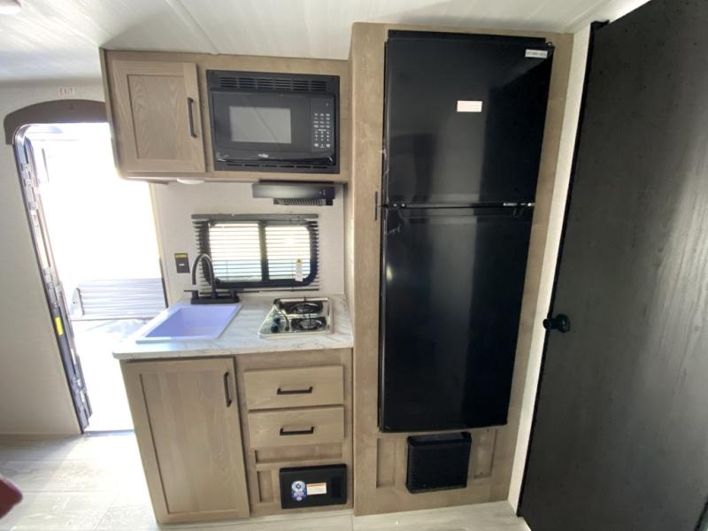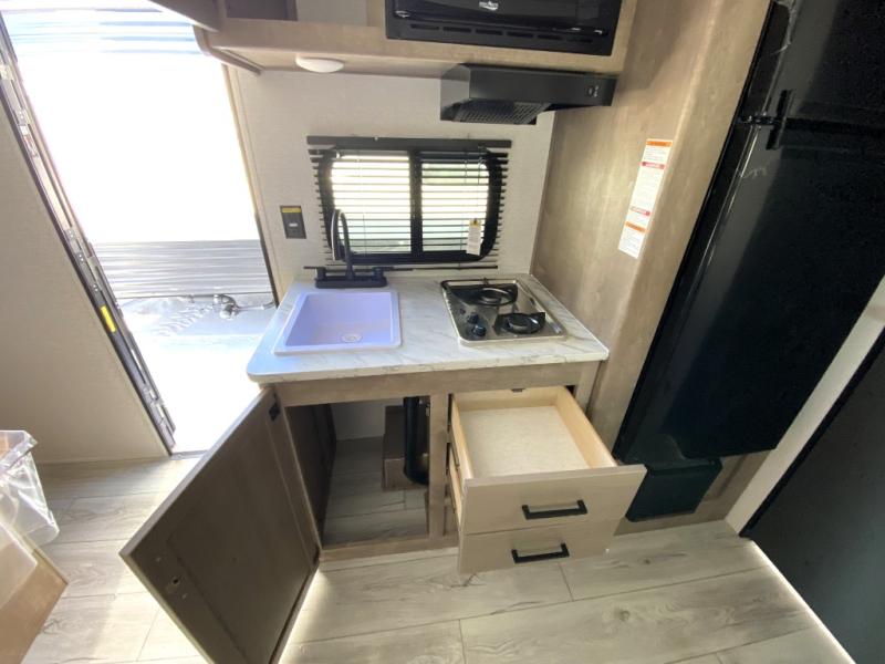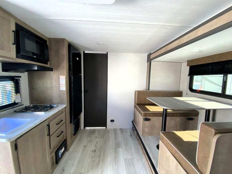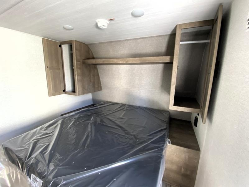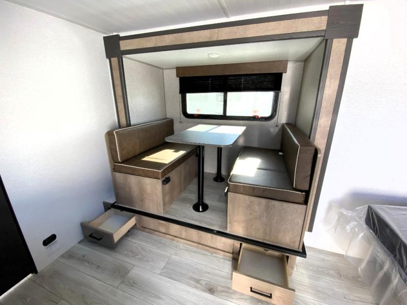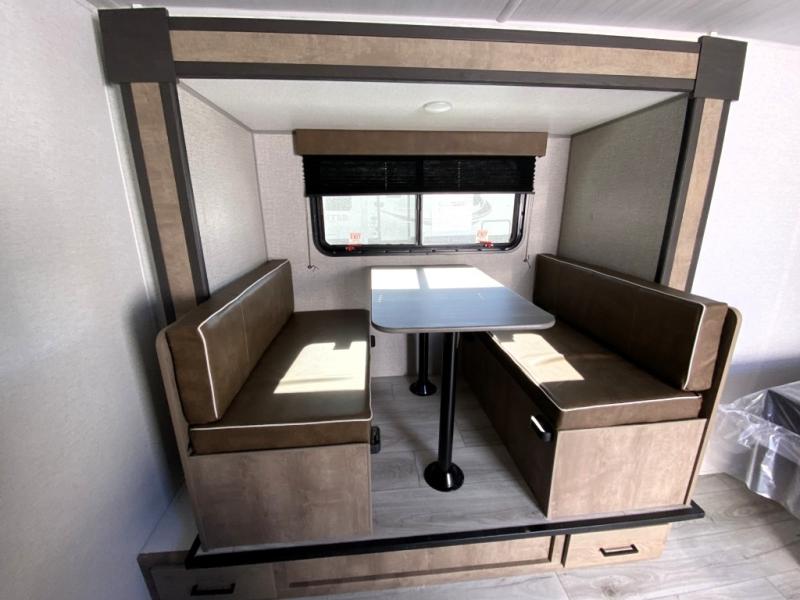 This is the perfect couple's RV with a walk-around queen bed up front with dual closets and nightstands, and a spacious rear bathroom. The galley kitchen offers a two burner cooktop and a sink to wash the dishes, plus there is a 7.7 cu. ft. 12V refrigerator for the cold items. You two can dine at the booth dinette slide which offers more floor space, plus there is drawer storage for your hand towels, pots and/or blankets. The 10' power awning provides protection so you can sit on your camping chairs while enjoying the outdoors.