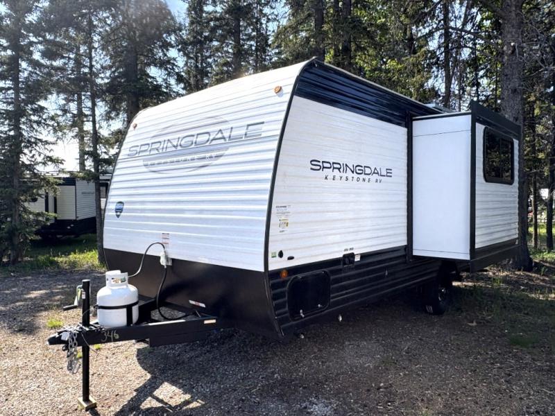 With any Springdale Classic Mini travel trailer by Keystone, you will enjoy lightweight towing thanks to their single-axle! You'll find the XL entry assist handle will make entering and exiting your unit easier than ever, and the power awning will provide protection from the sun as you relax in your camp chairs outside. Each model includes blackout night shades, solid wood cabinet doors and drawers, a shower skylight for more standing room, plus many more interior comforts. There is also a 5,000 BTU sidewall A/C and 20K BTU furnace to keep you comfortable, plus a Girard tankless water heater for endless hot showers!