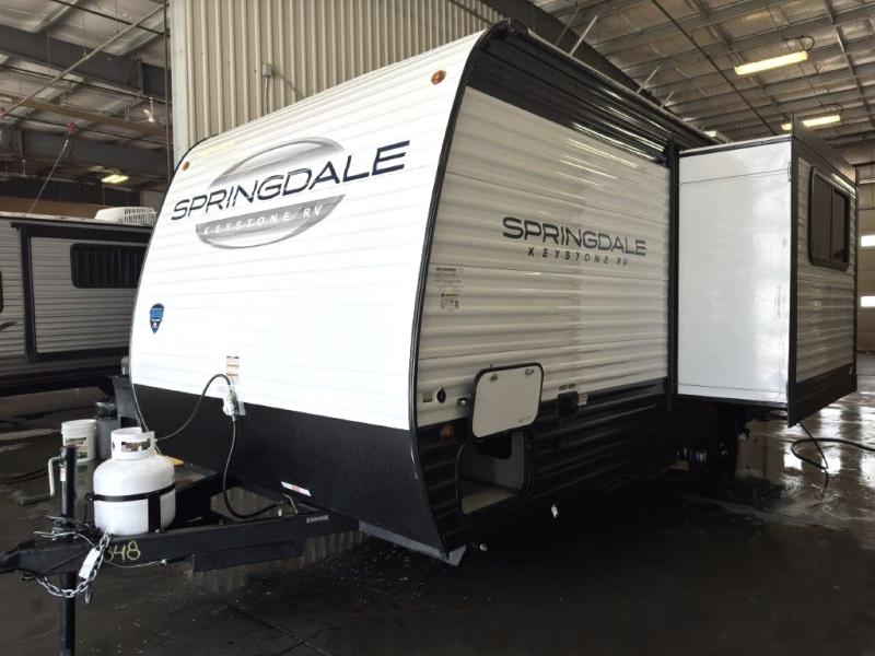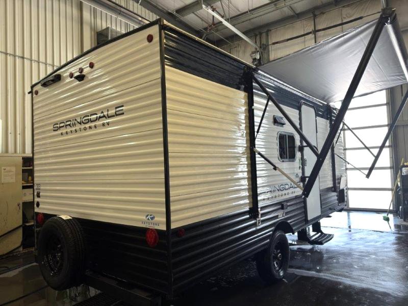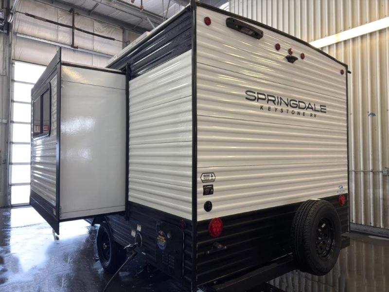 With any Springdale Classic Mini travel trailer by Keystone, you will enjoy lightweight towing thanks to their single-axle! You'll find the XL entry assist handle will make entering and exiting your unit easier than ever, and the power awning will provide protection from the sun as you relax in your camp chairs outside. Each model includes blackout night shades, solid wood cabinet doors and drawers, a shower skylight for more standing room, plus many more interior comforts. There is also a 5,000 BTU sidewall A/C and 20K BTU furnace to keep you comfortable, plus a Girard tankless water heater for endless hot showers!