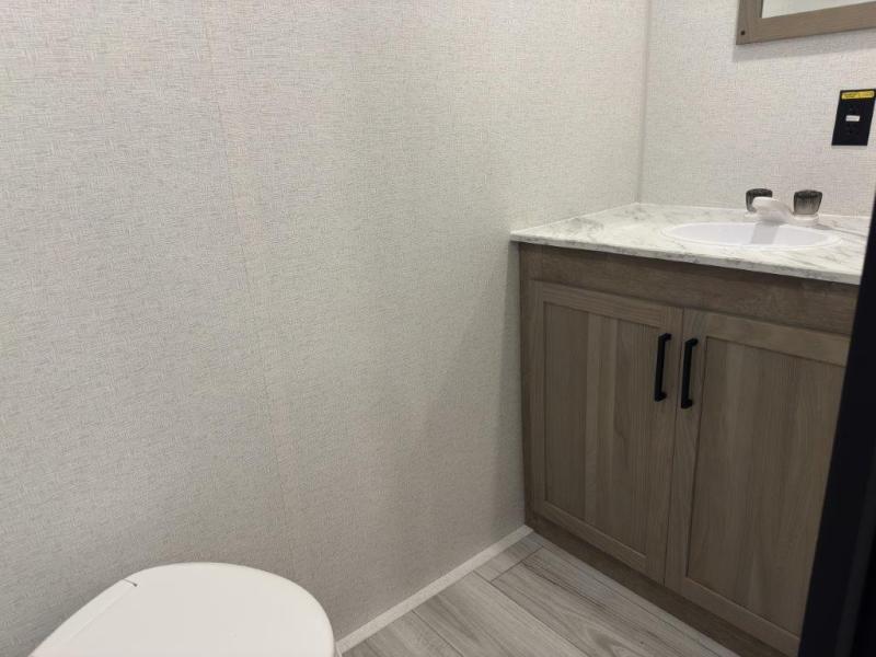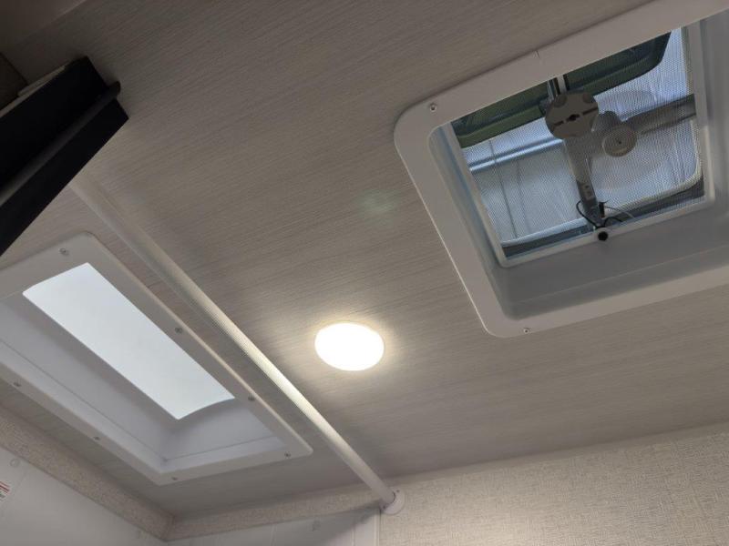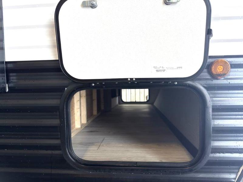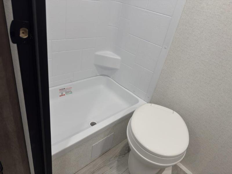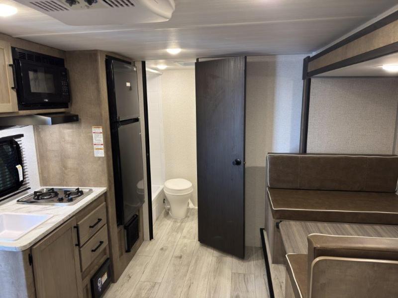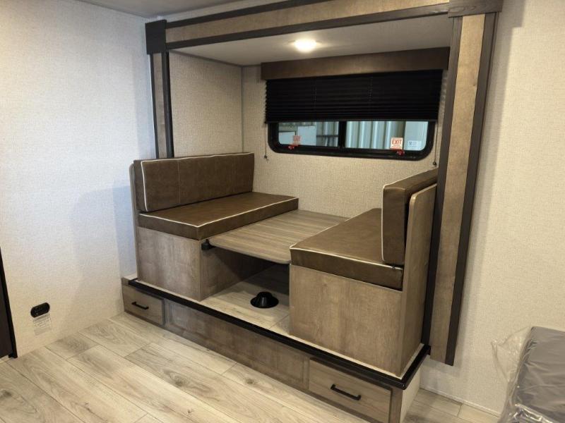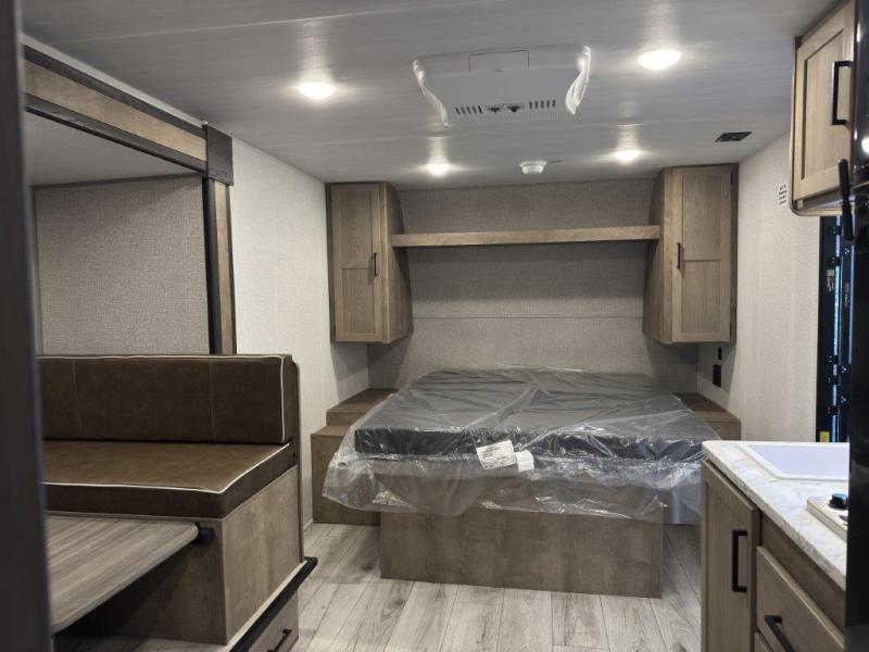 This is the perfect couple's RV with a walk-around queen bed up front with dual closets and nightstands, and a spacious rear bathroom. The galley kitchen offers a two burner cooktop and a sink to wash the dishes, plus there is a 7.7 cu. ft. 12V refrigerator for the cold items. You two can dine at the booth dinette slide which offers more floor space, plus there is drawer storage for your hand towels, pots and/or blankets. The 10' power awning provides protection so you can sit on your camping chairs while enjoying the outdoors.