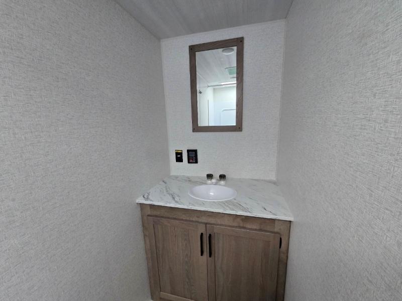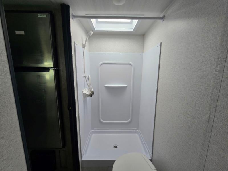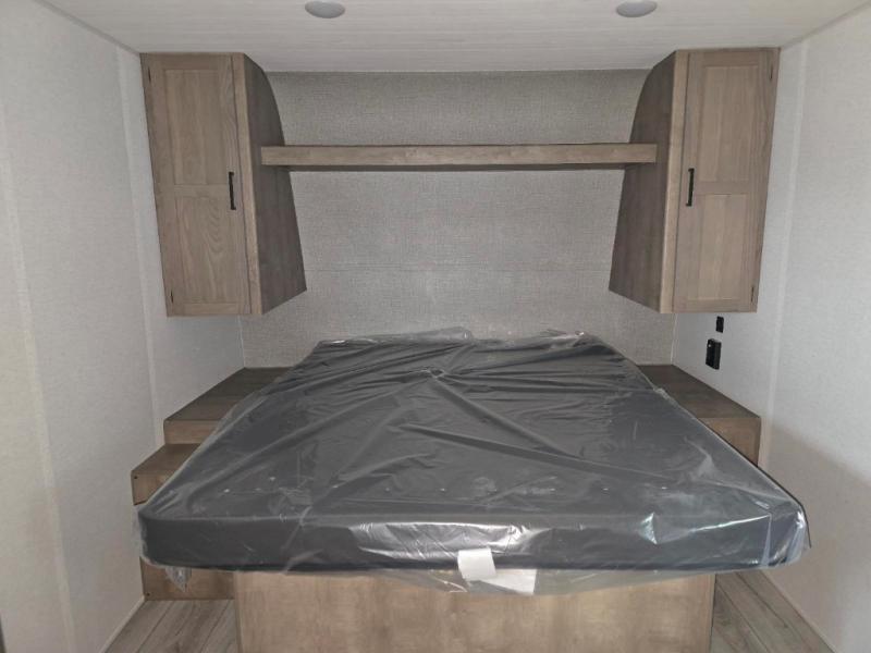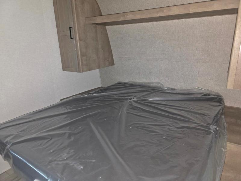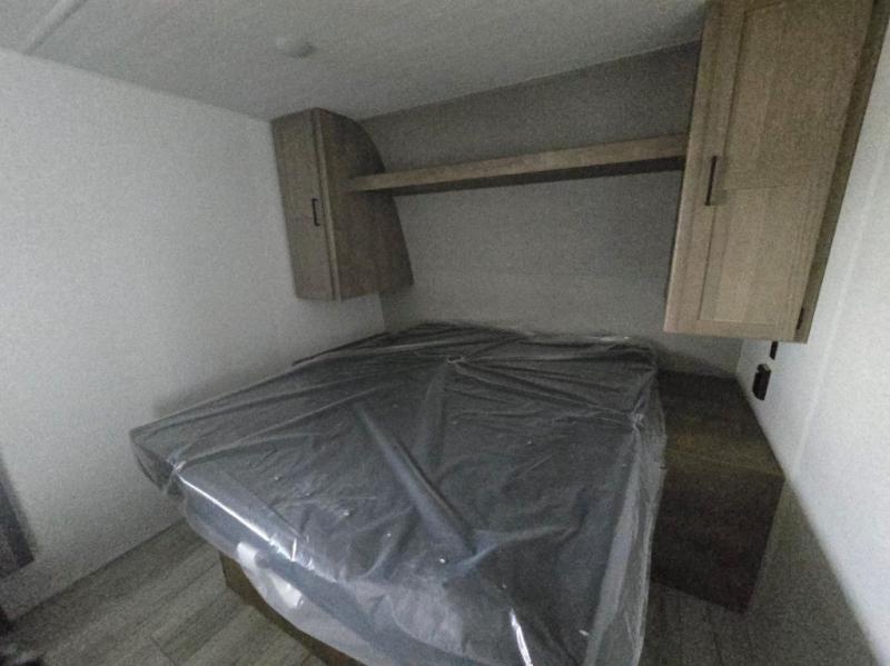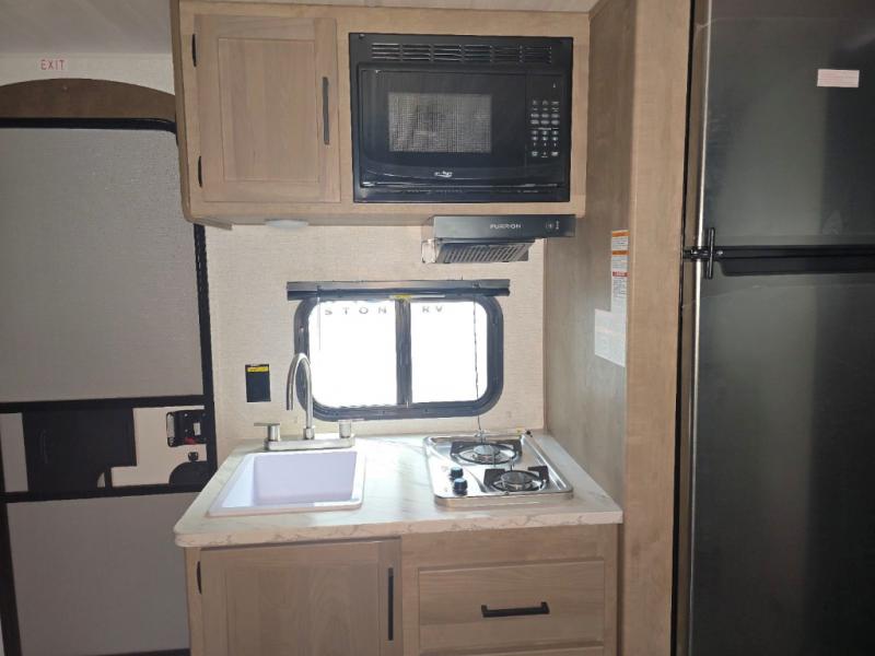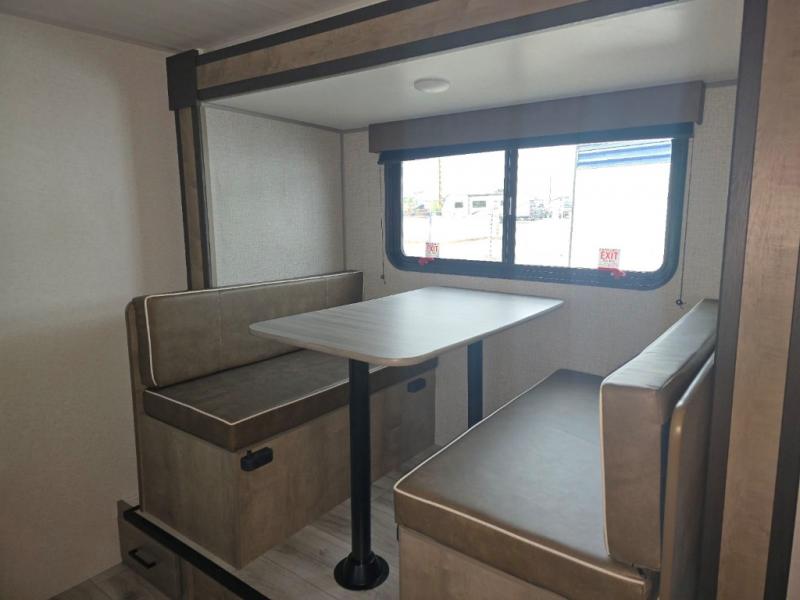 This is the perfect couple's RV with a walk-around queen bed up front with dual closets and nightstands, and a spacious rear bathroom. The galley kitchen offers a two burner cooktop and a sink to wash the dishes, plus there is a 7.7 cu. ft. 12V refrigerator for the cold items. You two can dine at the booth dinette slide which offers more floor space, plus there is drawer storage for your hand towels, pots and/or blankets. The 10' power awning provides protection so you can sit on your camping chairs while enjoying the outdoors.