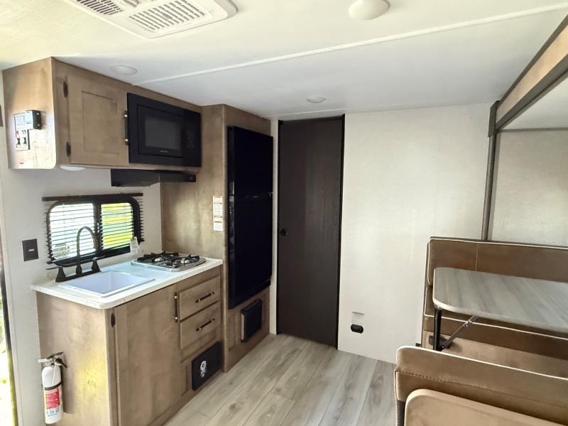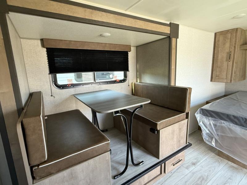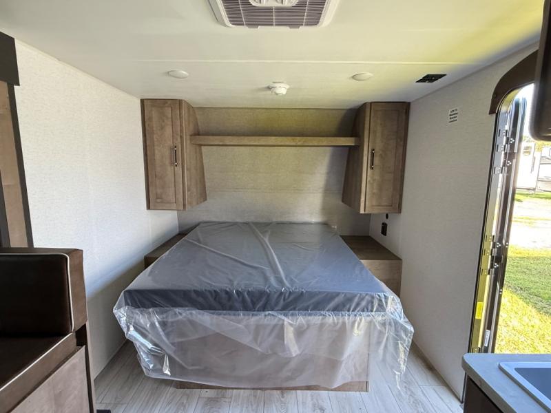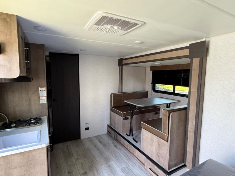 This is the perfect couple's RV with a walk-around queen bed up front with dual closets and nightstands, and a spacious rear bathroom. The galley kitchen offers a two-burner cooktop and a sink to wash the dishes, plus there is a 7.7 cu. ft. 12V refrigerator for the cold items. You two can dine at the booth dinette slide which offers more floor space, plus there is drawer storage for your hand towels, pots and/or blankets. The 10' power awning provides protection so you can sit on your camping chairs while enjoying the outdoors.