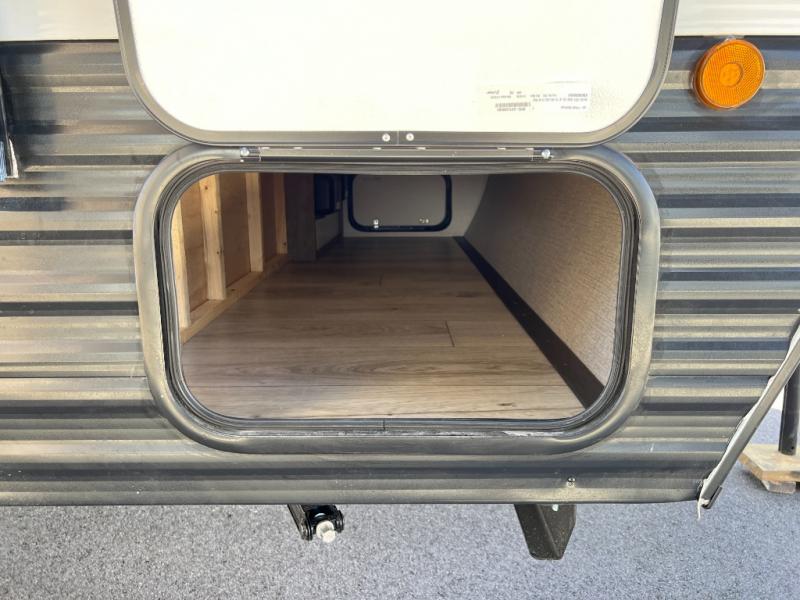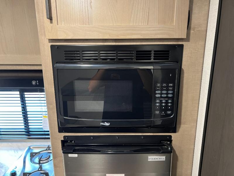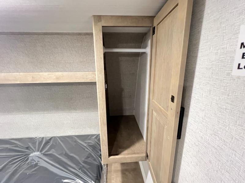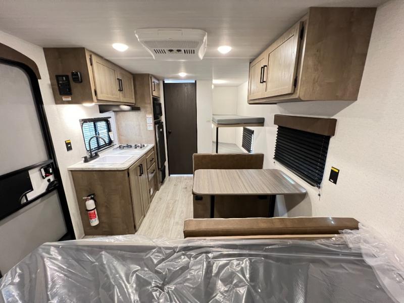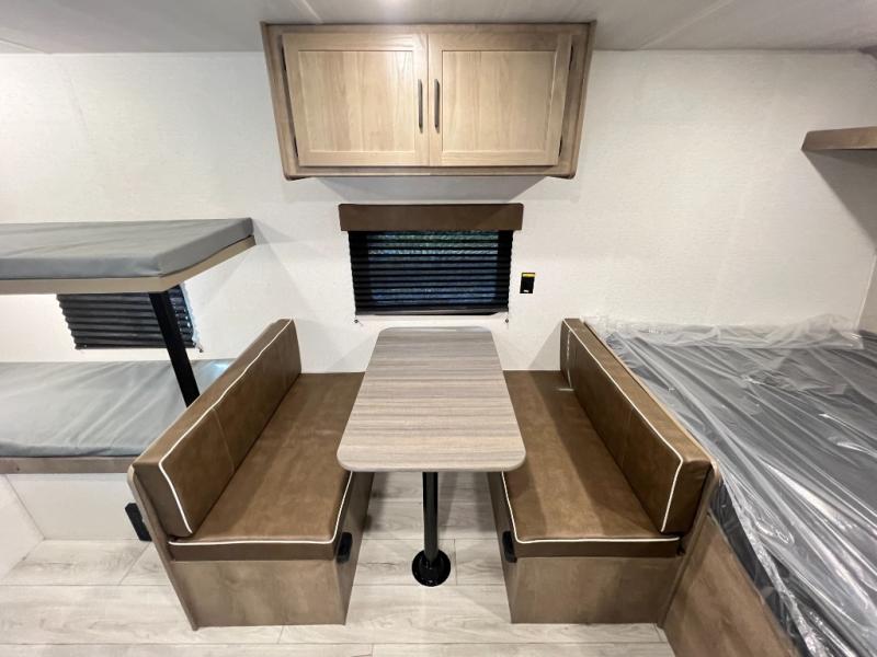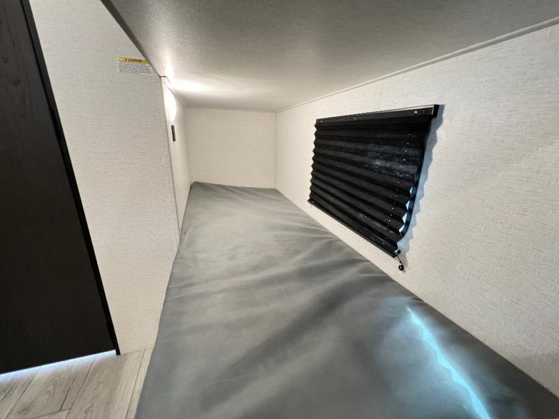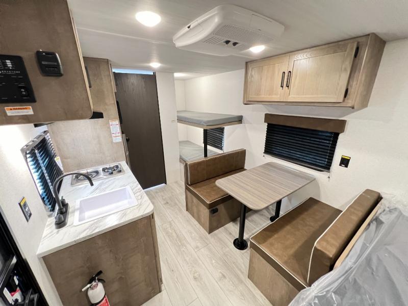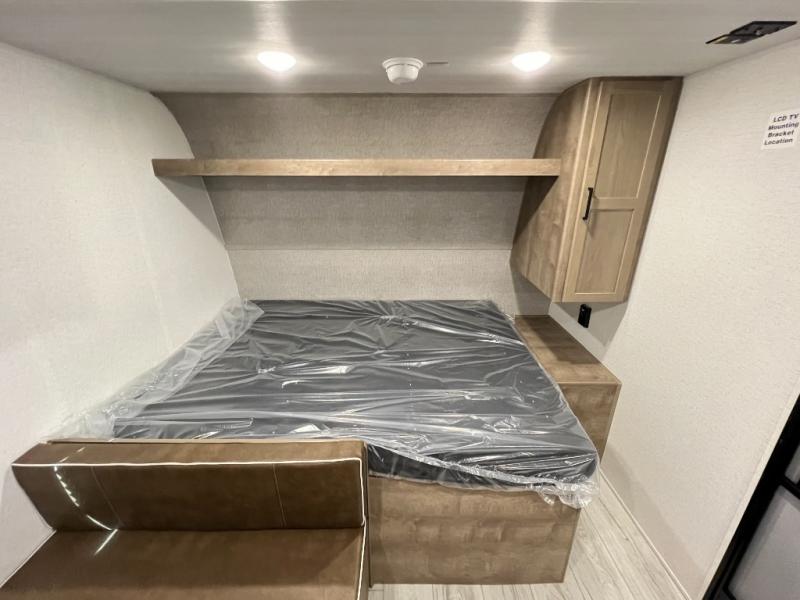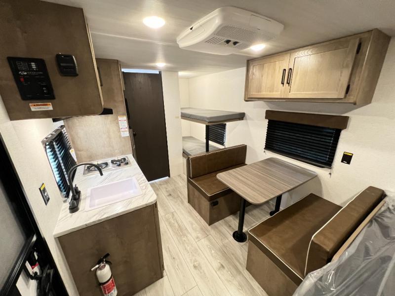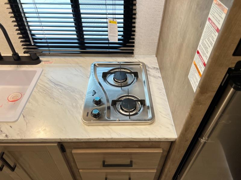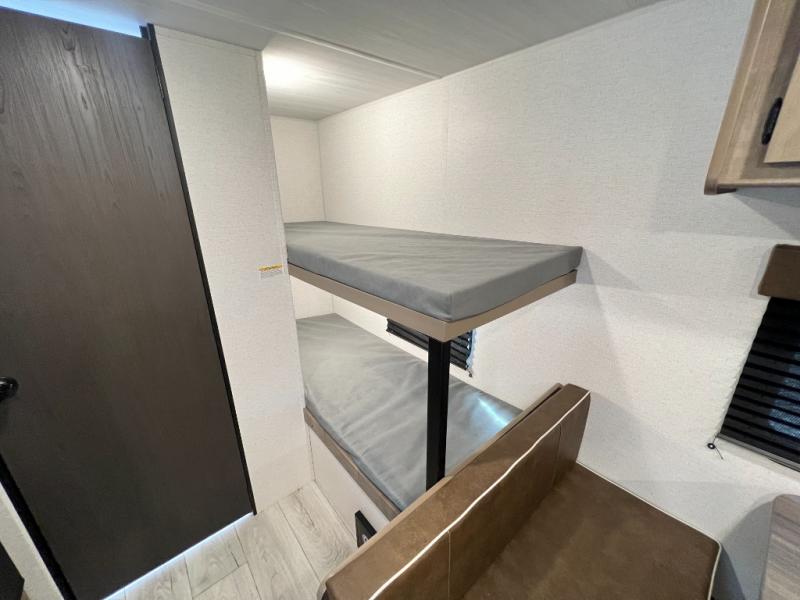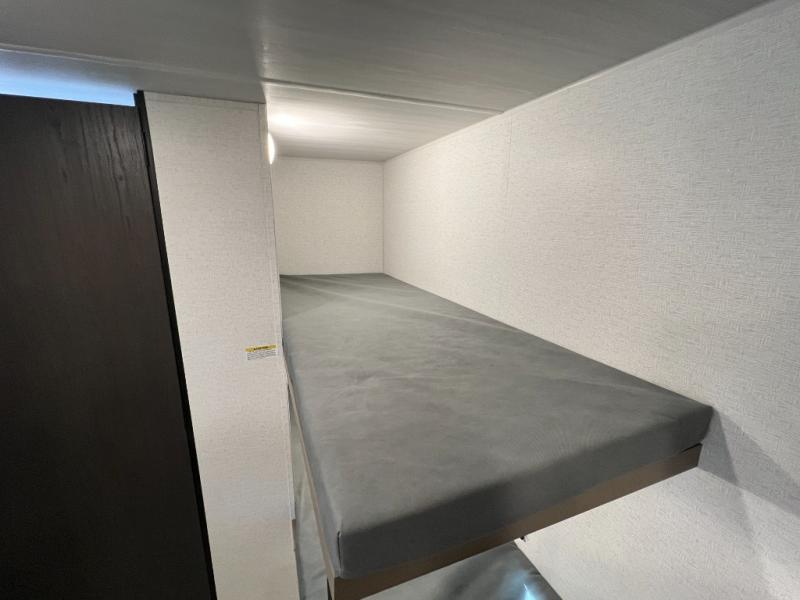 Get ready for outdoor fun with your favorite people when you have this trailer in tow! Once at your campsite, you can easily setup the 10' power awning, grab your camping chairs from the pass-thru storage, and relax or start playing. The cook will love the galley kitchen with the two burner cooktop, plus a refrigerator for cold items. If you like, you can eat inside at the booth dinette which doubles as sleeping space, and of course the kids will love the bunk beds next to the full bathroom. And you will sleep soundly on the front queen bed.