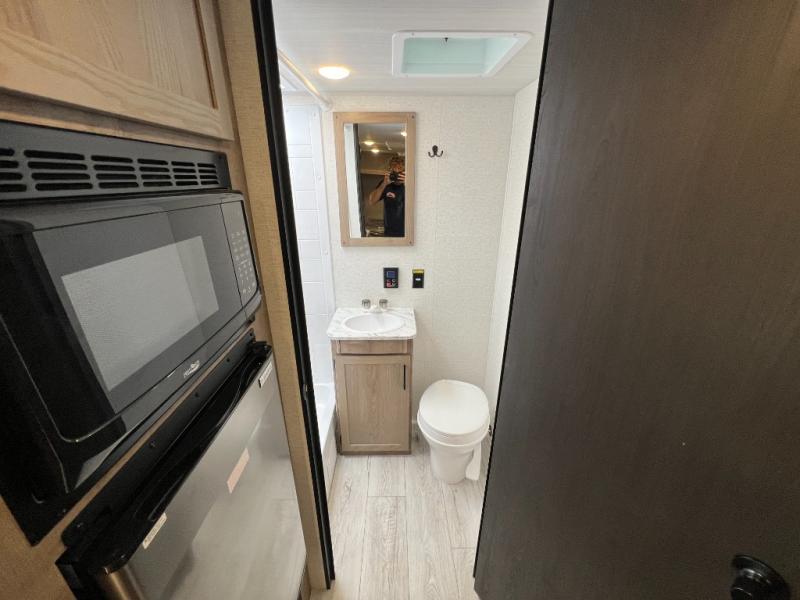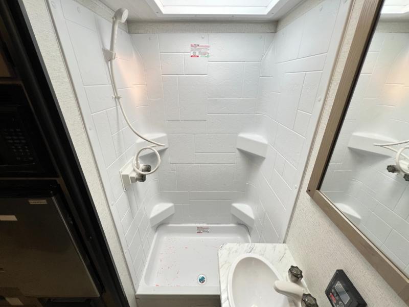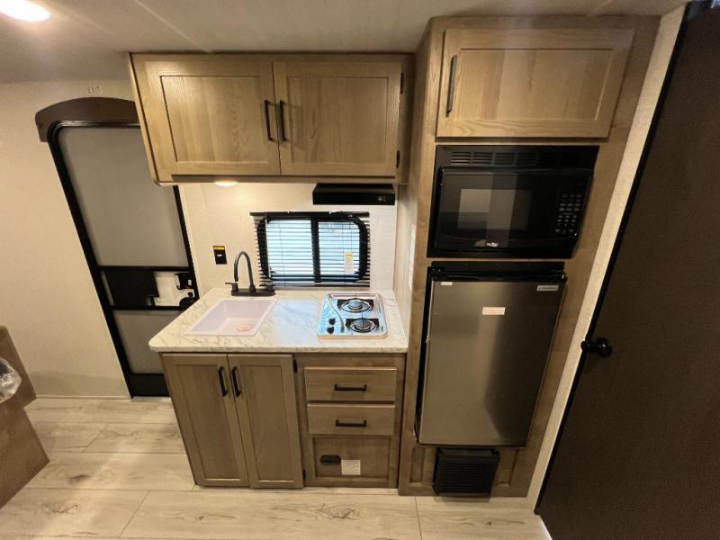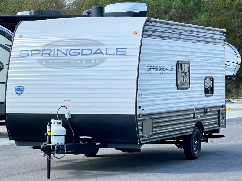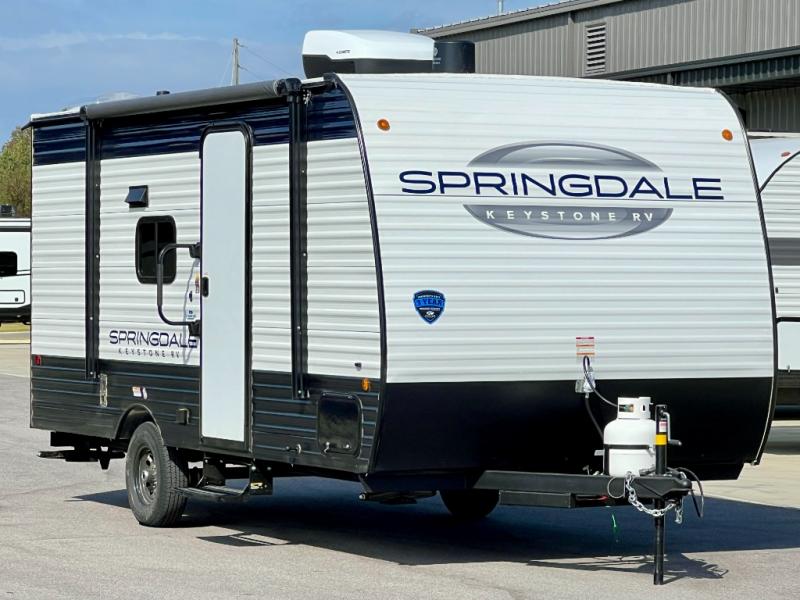 With any Springdale Classic Mini travel trailer by Keystone, you will enjoy lightweight towing thanks to their single-axle! You'll find the XL entry assist handle will make entering and exiting your unit easier than ever, and the power awning will provide protection from the sun as you relax in your camp chairs outside. Each model includes blackout night shades, solid wood cabinet doors and drawers, a shower skylight for more standing room, plus many more interior comforts. There is also a 5,000 BTU sidewall A/C and 20K BTU furnace to keep you comfortable, plus a Girard tankless water heater for endless hot showers!