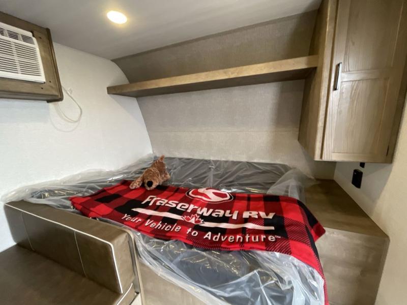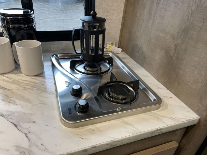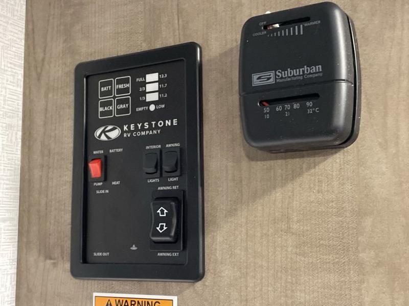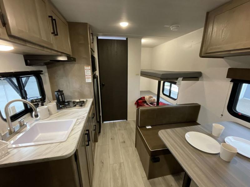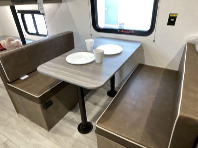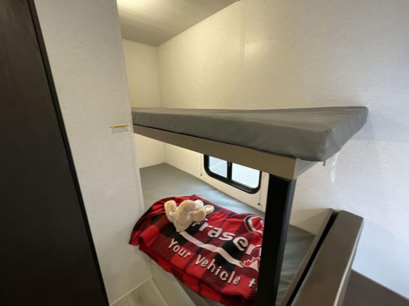 Get ready for outdoor fun with your favorite people when you have this trailer in tow! Once at your campsite, you can easily setup the 10' power awning, grab your camping chairs from the pass-thru storage, and relax or start playing. The cook will love the galley kitchen with the two burner cooktop, plus a refrigerator for cold items. If you like, you can eat inside at the booth dinette which doubles as sleeping space, and of course the kids will love the bunk beds next to the full bathroom. And you will sleep soundly on the front queen bed.