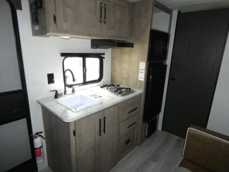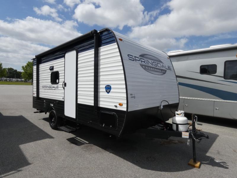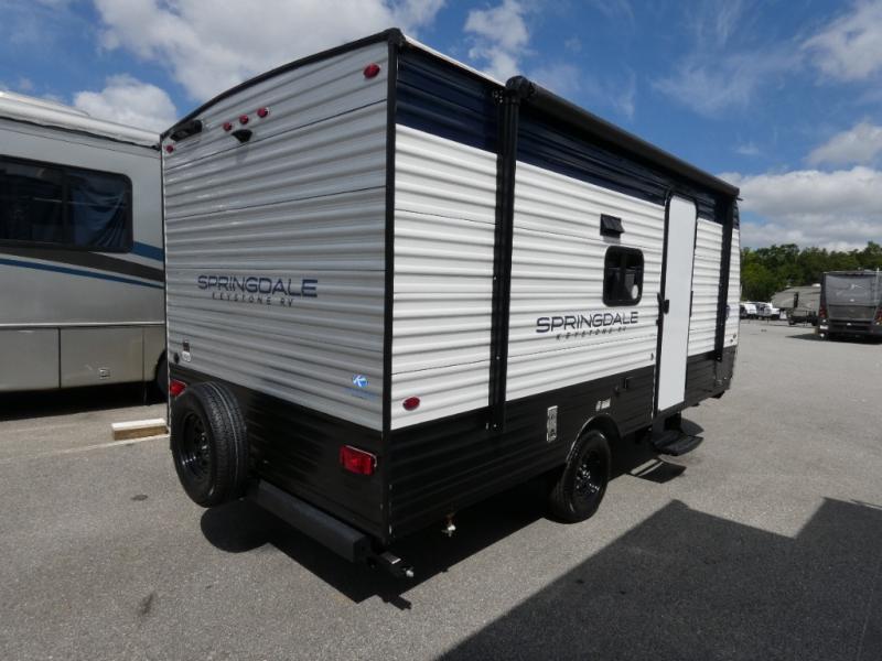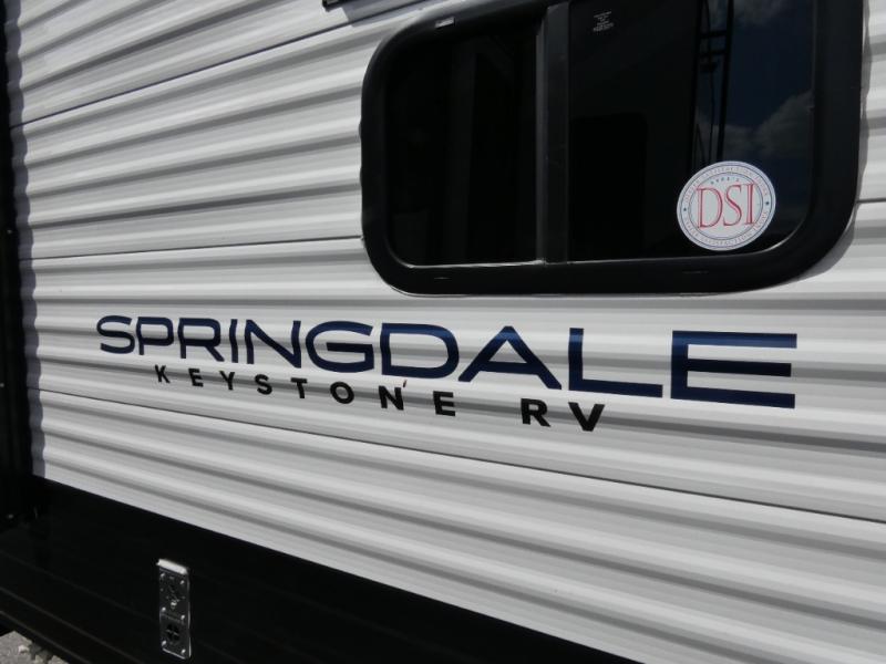 With any Springdale Classic Mini travel trailer by Keystone, you will enjoy lightweight towing thanks to their single-axle! You'll find the XL entry assist handle will make entering and exiting your unit easier than ever, and the power awning will provide protection from the sun as you relax in your camp chairs outside. Each model includes blackout night shades, solid wood cabinet doors and drawers, a shower skylight for more standing room, plus many more interior comforts. There is also a 5,000 BTU sidewall A/C and 20K BTU furnace to keep you comfortable, plus a Girard tankless water heater for endless hot showers!