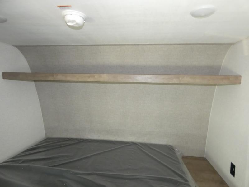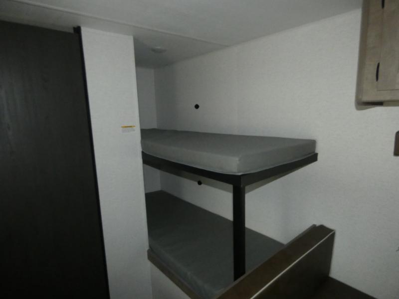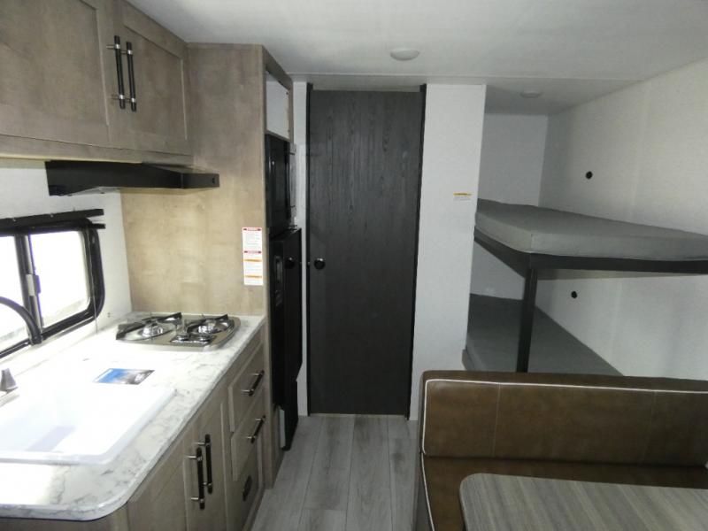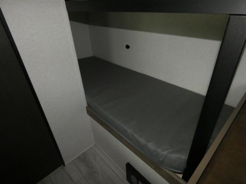 Get ready for outdoor fun with your favorite people when you have this trailer in tow! Once at your campsite, you can easily setup the 10' power awning, grab your camping chairs from the pass-thru storage, and relax or start playing. The cook will love the galley kitchen with the two burner cooktop, plus a refrigerator for cold items. If you like, you can eat inside at the booth dinette which doubles as sleeping space, and of course the kids will love the bunk beds next to the full bathroom. And you will sleep soundly on the front queen bed.