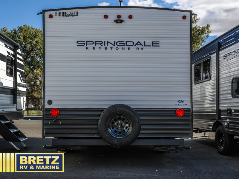 With any Springdale Classic Mini travel trailer by Keystone, you will enjoy lightweight towing thanks to their single-axle! You'll find the XL entry assist handle will make entering and exiting your unit easier than ever, and the power awning will provide protection from the sun as you relax in your camp chairs outside. Each model includes blackout night shades, solid wood cabinet doors and drawers, a shower skylight for more standing room, plus many more interior comforts. There is also a 5,000 BTU sidewall A/C and 20K BTU furnace to keep you comfortable, plus a Girard tankless water heater for endless hot showers!