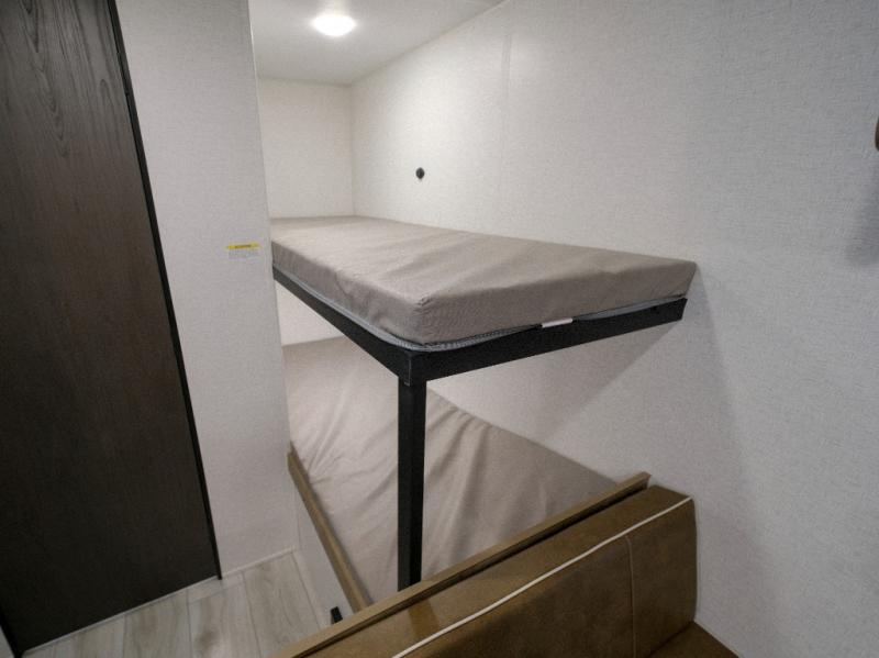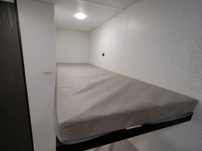 Get ready for outdoor fun with your favorite people when you have this trailer in tow! Once at your campsite, you can easily setup the 10' power awning, grab your camping chairs from the pass-thru storage, and relax or start playing. The cook will love the galley kitchen with the two burner cooktop, plus a refrigerator for cold items. If you like, you can eat inside at the booth dinette which doubles as sleeping space, and of course the kids will love the bunk beds next to the full bathroom. And you will sleep soundly on the front queen bed.