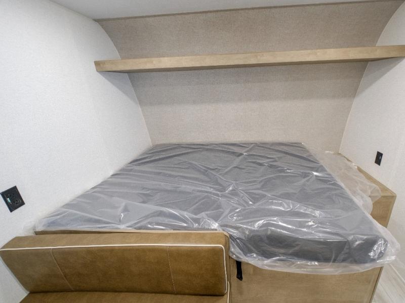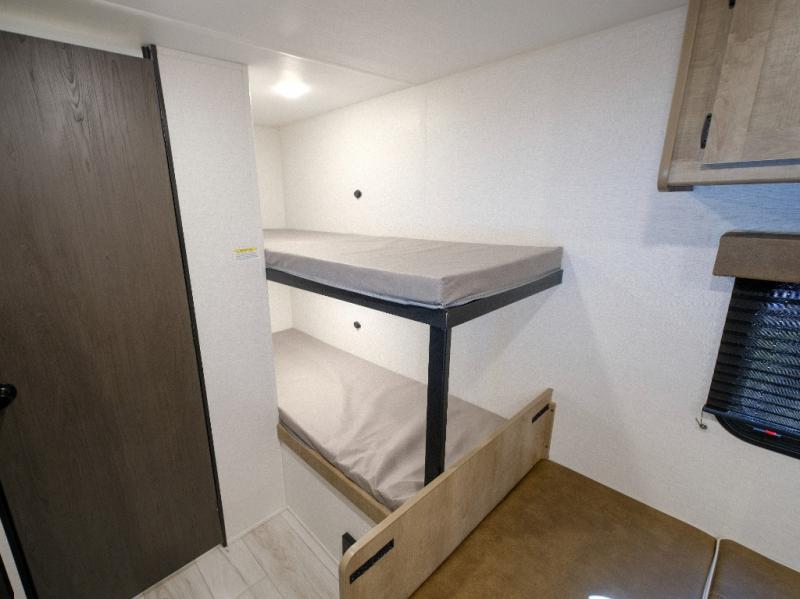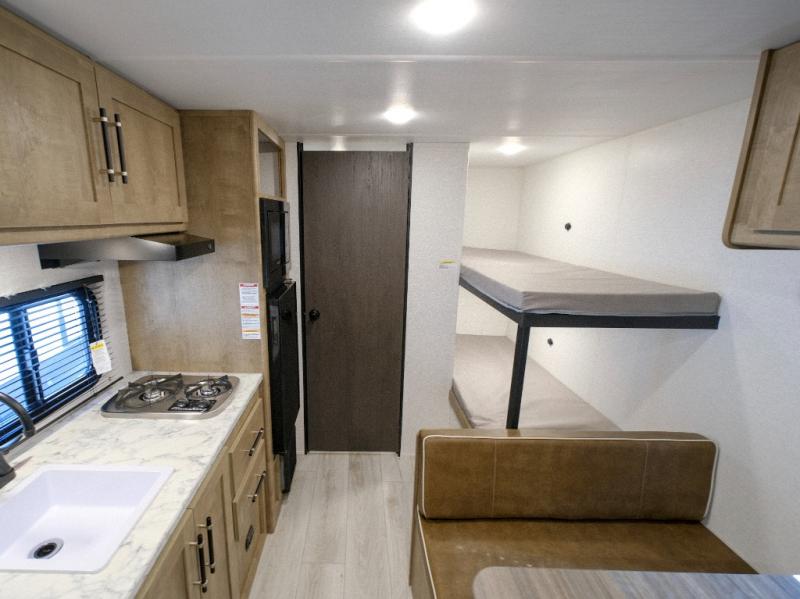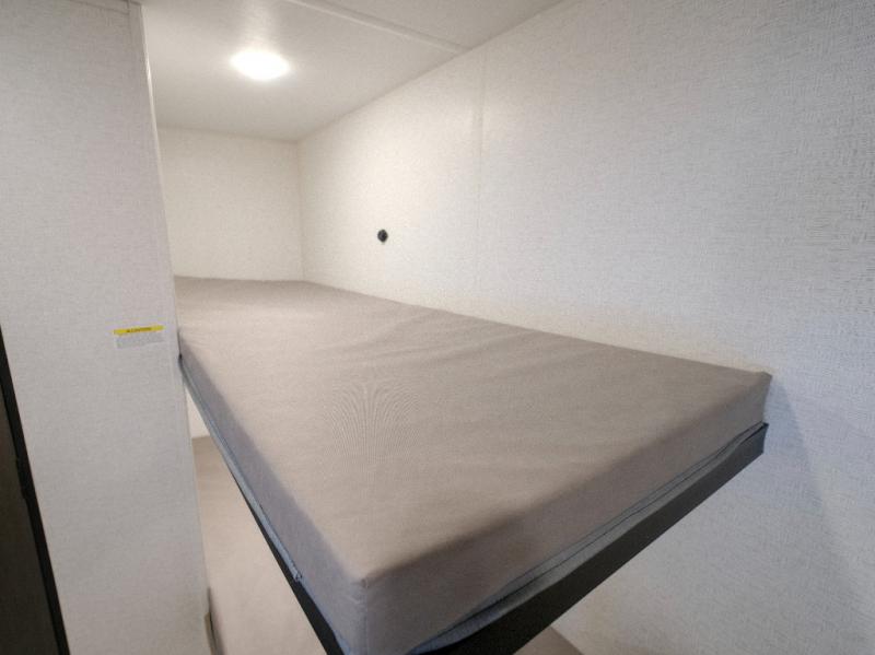 Get ready for outdoor fun with your favorite people when you have this trailer in tow! Once at your campsite, you can easily setup the 10' power awning, grab your camping chairs from the pass-thru storage, and relax or start playing. The cook will love the galley kitchen with the two burner cooktop, plus a refrigerator for cold items. If you like, you can eat inside at the booth dinette which doubles as sleeping space, and of course the kids will love the bunk beds next to the full bathroom. And you will sleep soundly on the front queen bed.