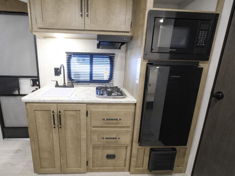 With any Springdale Classic Mini travel trailer by Keystone, you will enjoy lightweight towing thanks to their single-axle! You'll find the XL entry assist handle will make entering and exiting your unit easier than ever, and the power awning will provide protection from the sun as you relax in your camp chairs outside. Each model includes blackout night shades, solid wood cabinet doors and drawers, a shower skylight for more standing room, plus many more interior comforts. There is also a 5,000 BTU sidewall A/C and 20K BTU furnace to keep you comfortable, plus a Girard tankless water heater for endless hot showers!