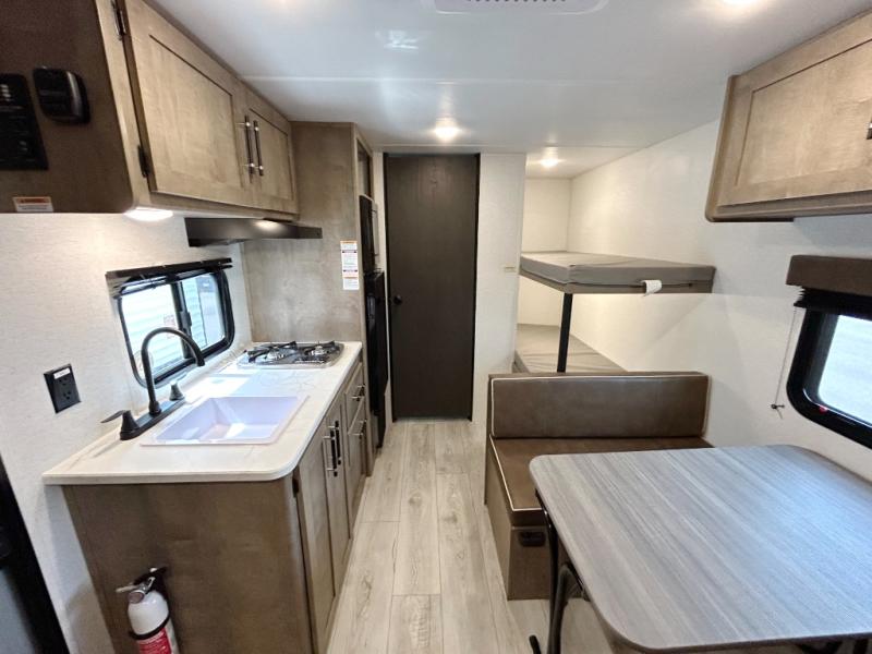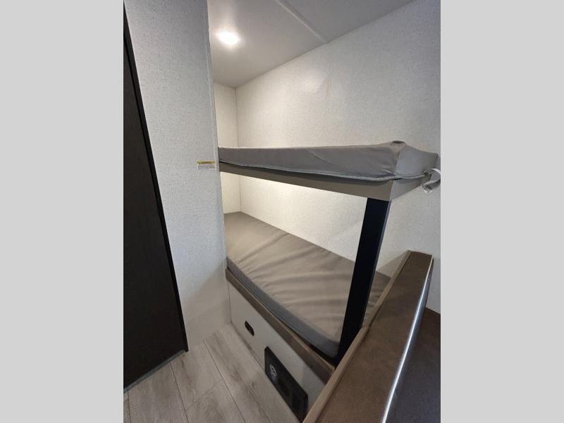 Get ready for outdoor fun with your favorite people when you have this trailer in tow! Once at your campsite, you can easily setup the 10' power awning, grab your camping chairs from the pass-thru storage, and relax or start playing. The cook will love the galley kitchen with the two burner cooktop, plus a refrigerator for cold items. If you like, you can eat inside at the booth dinette which doubles as sleeping space, and of course the kids will love the bunk beds next to the full bathroom. And you will sleep soundly on the front queen bed.