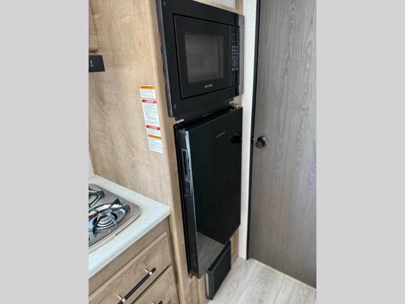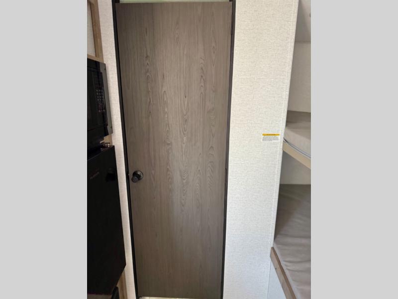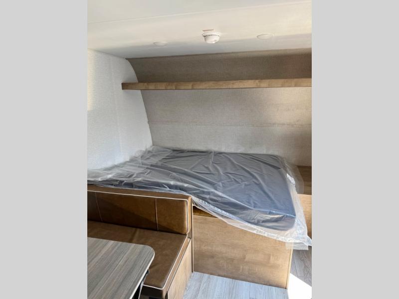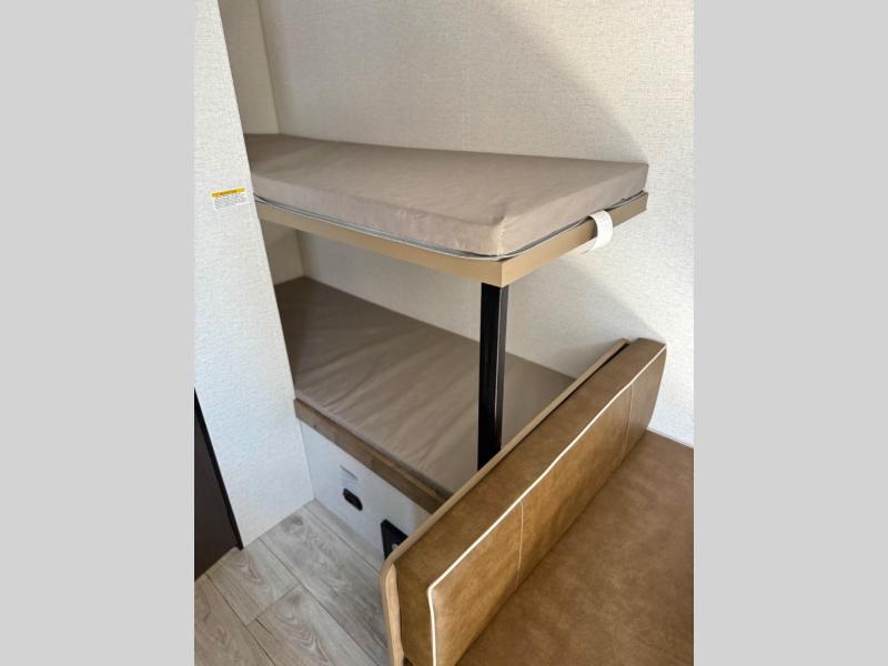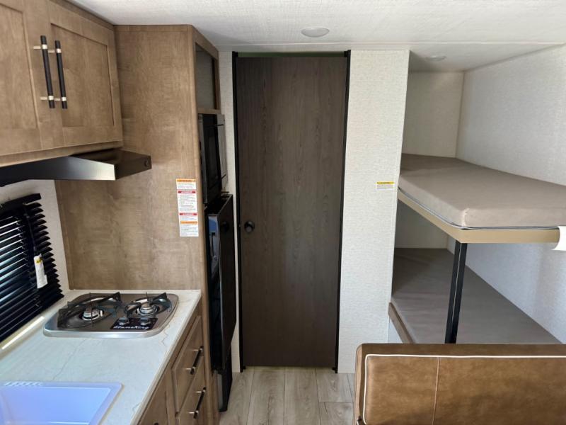 Get ready for outdoor fun with your favorite people when you have this trailer in tow! Once at your campsite, you can easily setup the 10' power awning, grab your camping chairs from the pass-thru storage, and relax or start playing. The cook will love the galley kitchen with the two burner cooktop, plus a refrigerator for cold items. If you like, you can eat inside at the booth dinette which doubles as sleeping space, and of course the kids will love the bunk beds next to the full bathroom. And you will sleep soundly on the front queen bed.