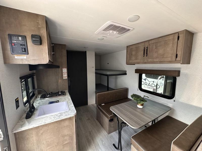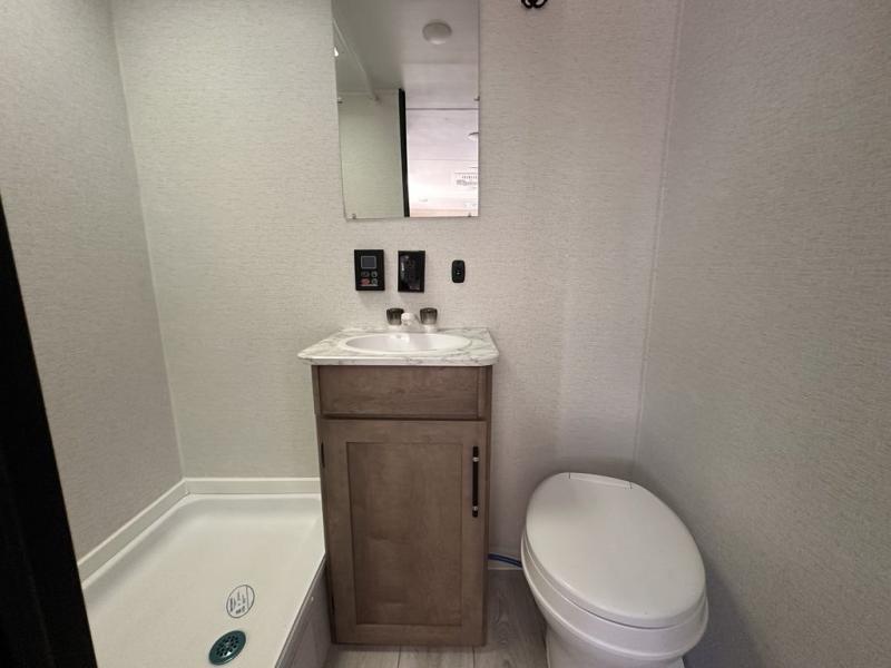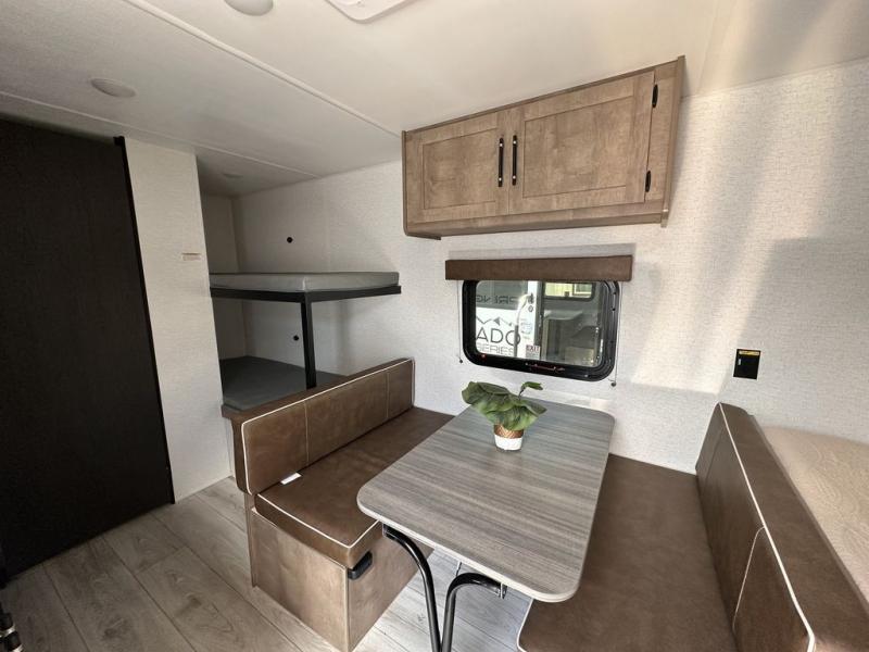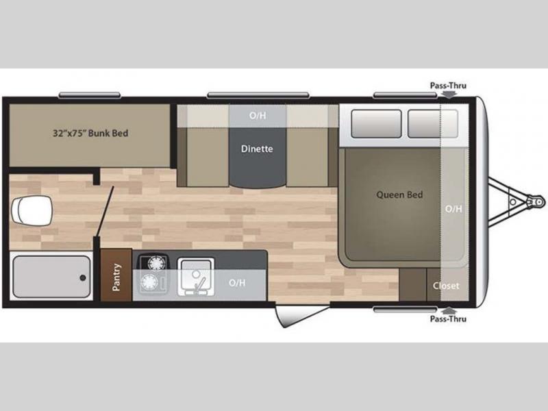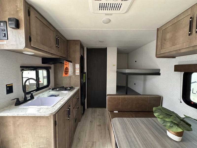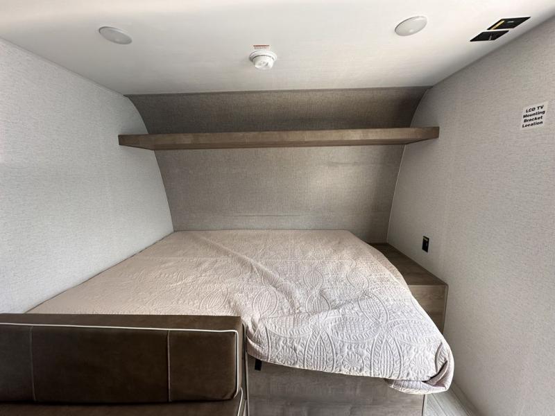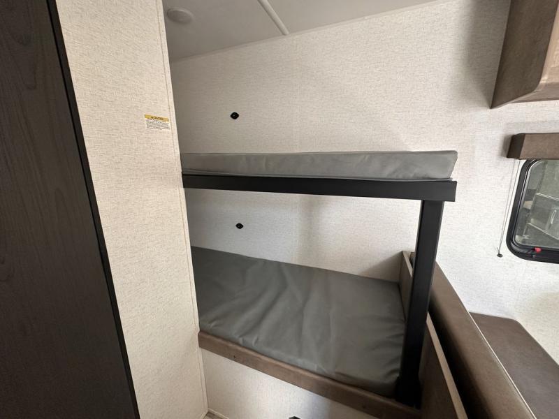 Get ready for outdoor fun with your favorite people when you have this trailer in tow! Once at your campsite, you can easily setup the 10' power awning, grab your camping chairs from the pass-thru storage, and relax or start playing. The cook will love the galley kitchen with the two burner cooktop, plus a refrigerator for cold items. If you like, you can eat inside at the booth dinette which doubles as sleeping space, and of course the kids will love the bunk beds next to the full bathroom. And you will sleep soundly on the front queen bed.