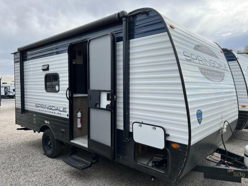 With any Springdale Classic Mini travel trailer by Keystone, you will enjoy lightweight towing thanks to their single-axle! You'll find the XL entry assist handle will make entering and exiting your unit easier than ever, and the power awning will provide protection from the sun as you relax in your camp chairs outside. Each model includes blackout night shades, solid wood cabinet doors and drawers, a shower skylight for more standing room, plus many more interior comforts. There is also a 5,000 BTU sidewall A/C and 20K BTU furnace to keep you comfortable, plus a Girard tankless water heater for endless hot showers!