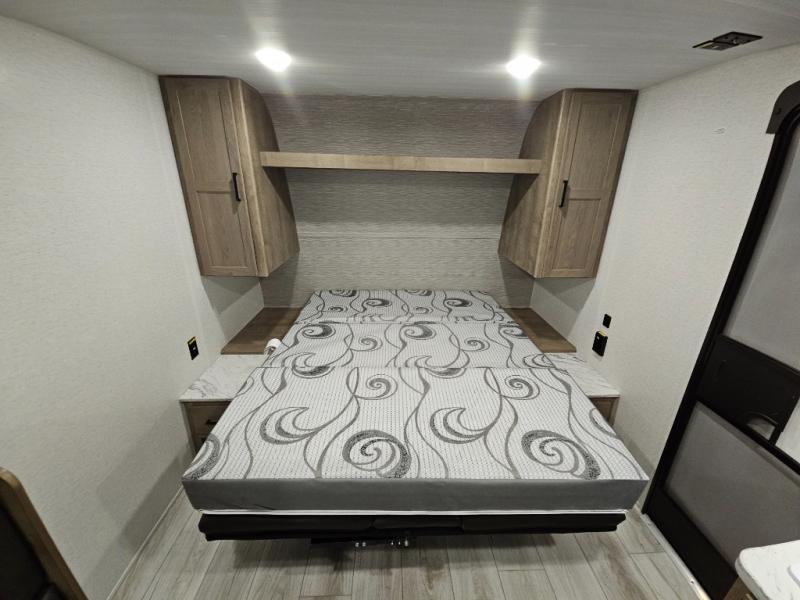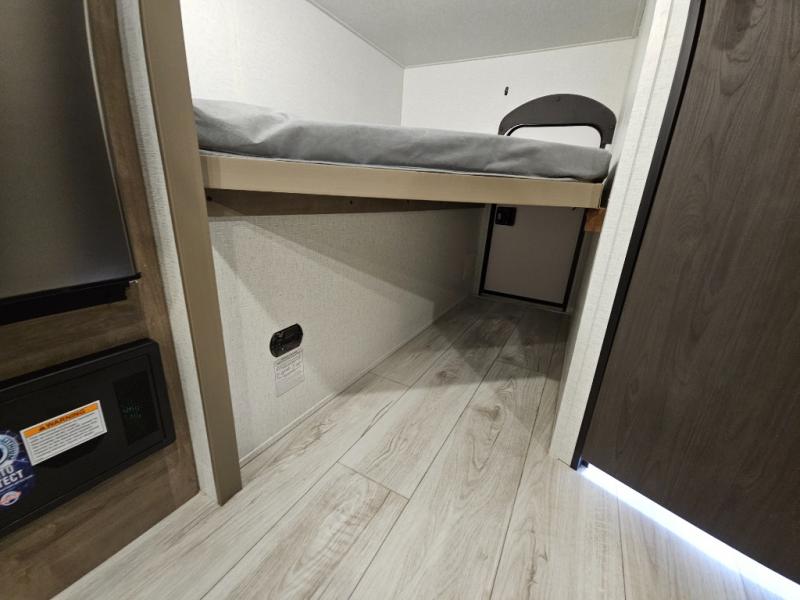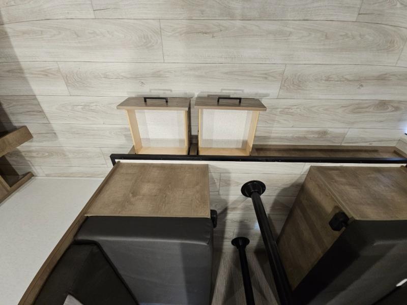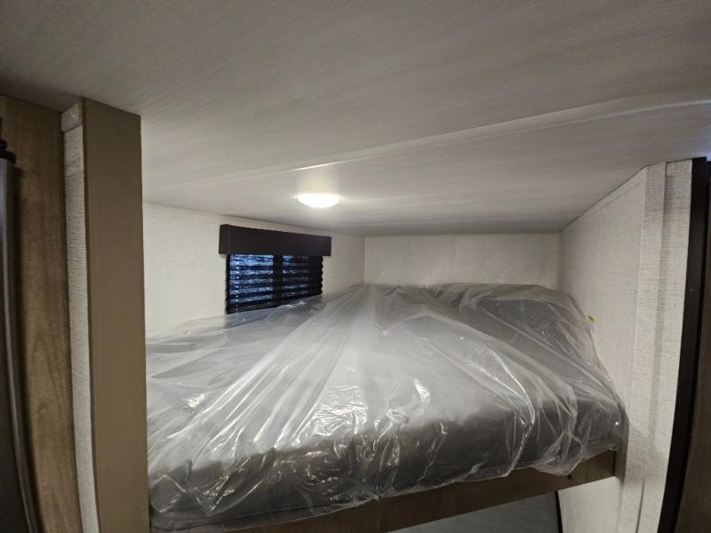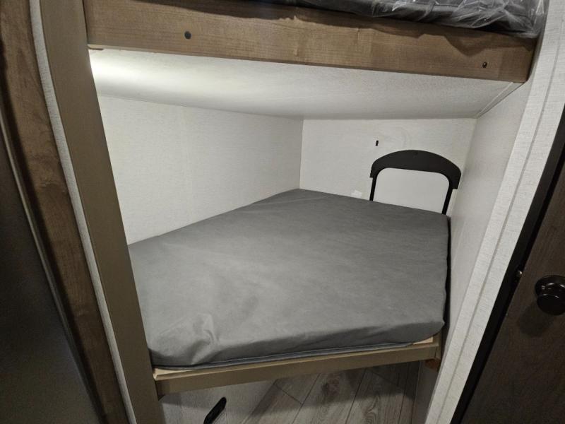 This cute Springdale Classic Mini bunk model will easily sleep seven with the double-size bunks, booth dinette slide, and queen Murphy bed which features a fold-down sofa at the end. During the daytime, you can have the seating you need and want, and at night the sofa folds to become part of the front bed. The rear corner bath is convenient and features a tub/shower, toilet, and sink. The kitchen is fully equipped to allow you to cook as you travel. Enjoy them while under the 15' power awning. A handy pass-thru storage compartment up front offers ample space for camp equipment, and there is additional storage accessible beneath the bunk in back.