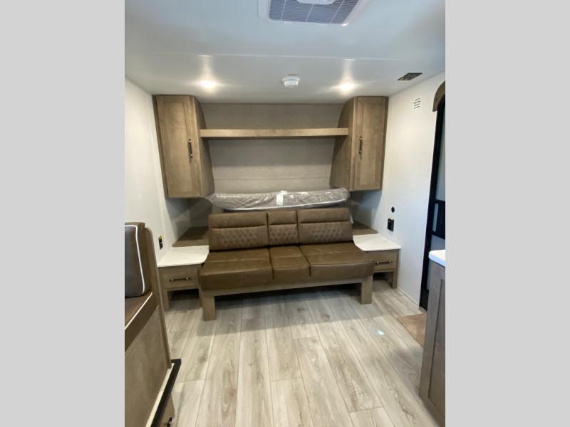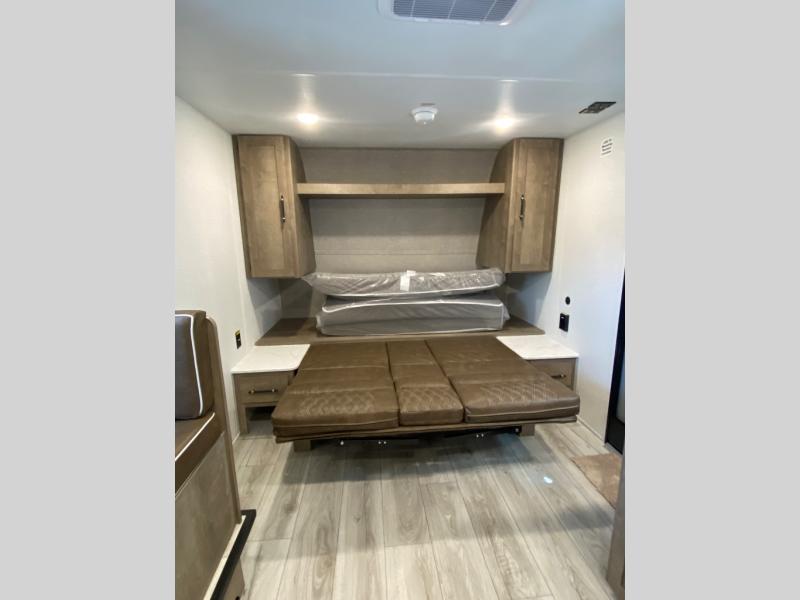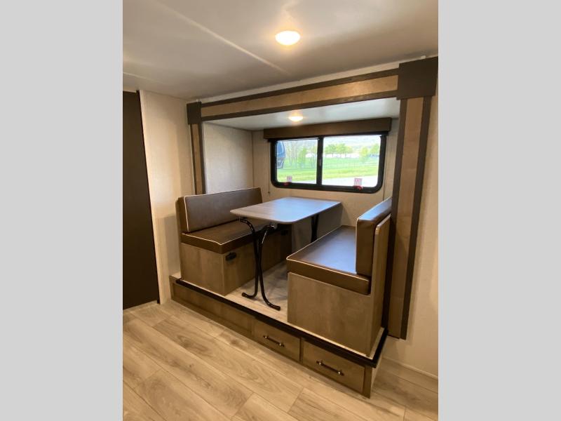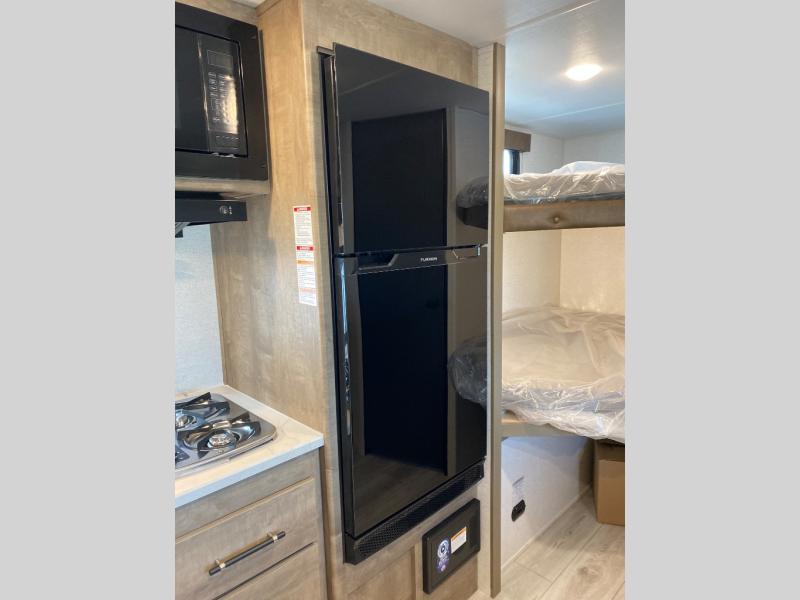 This cute Springdale Classic Mini bunk model will easily sleep seven with the double-size bunks, booth dinette slide, and queen Murphy bed which features a fold-down sofa at the end. During the daytime, you can have the seating you need and want, and at night the sofa folds to become part of the front bed. The rear corner bath is convenient and features a tub/shower, toilet, and sink. The kitchen is fully equipped to allow you to cook as you travel. Enjoy them while under the 15' power awning. A handy pass-thru storage compartment up front offers ample space for camp equipment, and there is additional storage accessible beneath the bunk in back.