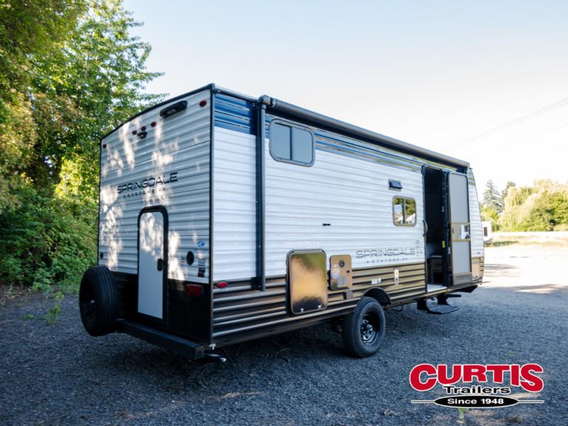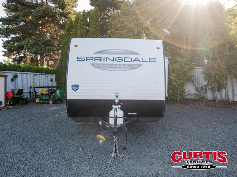 With any Springdale Classic Mini travel trailer by Keystone, you will enjoy lightweight towing thanks to their single-axle! You'll find the XL entry assist handle will make entering and exiting your unit easier than ever, and the power awning will provide protection from the sun as you relax in your camp chairs outside. Each model includes blackout night shades, solid wood cabinet doors and drawers, a shower skylight for more standing room, plus many more interior comforts. There is also a 5,000 BTU sidewall A/C and 20K BTU furnace to keep you comfortable, plus a Girard tankless water heater for endless hot showers!