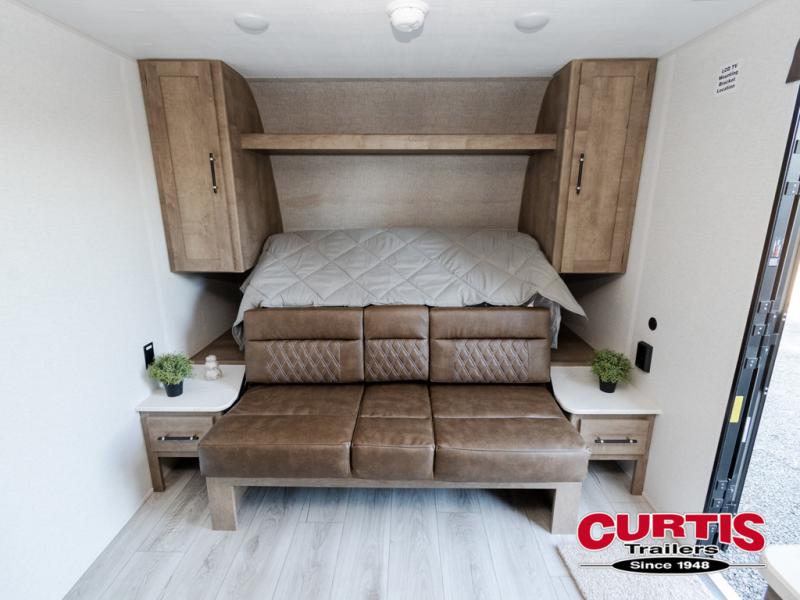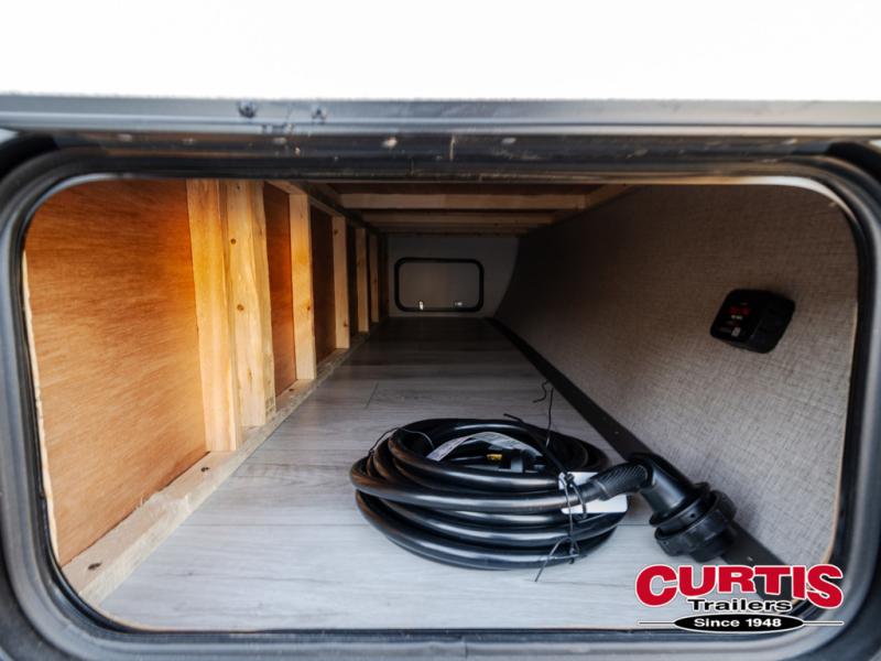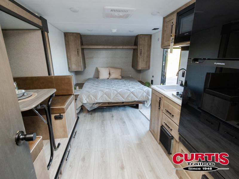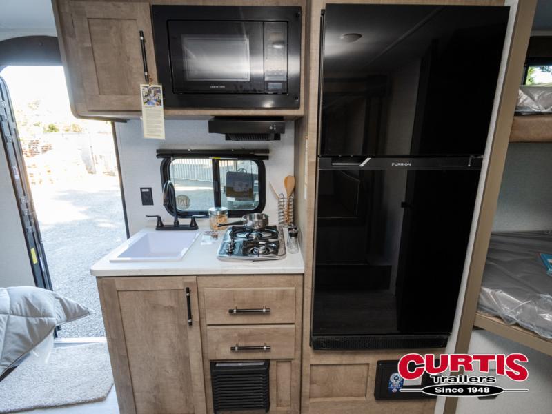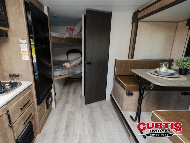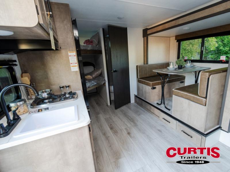 This cute Springdale Classic Mini bunk model will easily sleep seven with the double-size bunks, booth dinette slide, and queen Murphy bed which features a fold-down sofa at the end. During the daytime, you can have the seating you need and want, and at night the sofa folds to become part of the front bed. The rear corner bath is convenient and features a tub/shower, toilet, and sink. The kitchen is fully equipped to allow you to cook as you travel. Enjoy them while under the 15' power awning. A handy pass-thru storage compartment up front offers ample space for camp equipment, and there is additional storage accessible beneath the bunk in back.